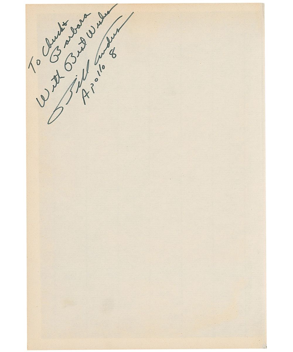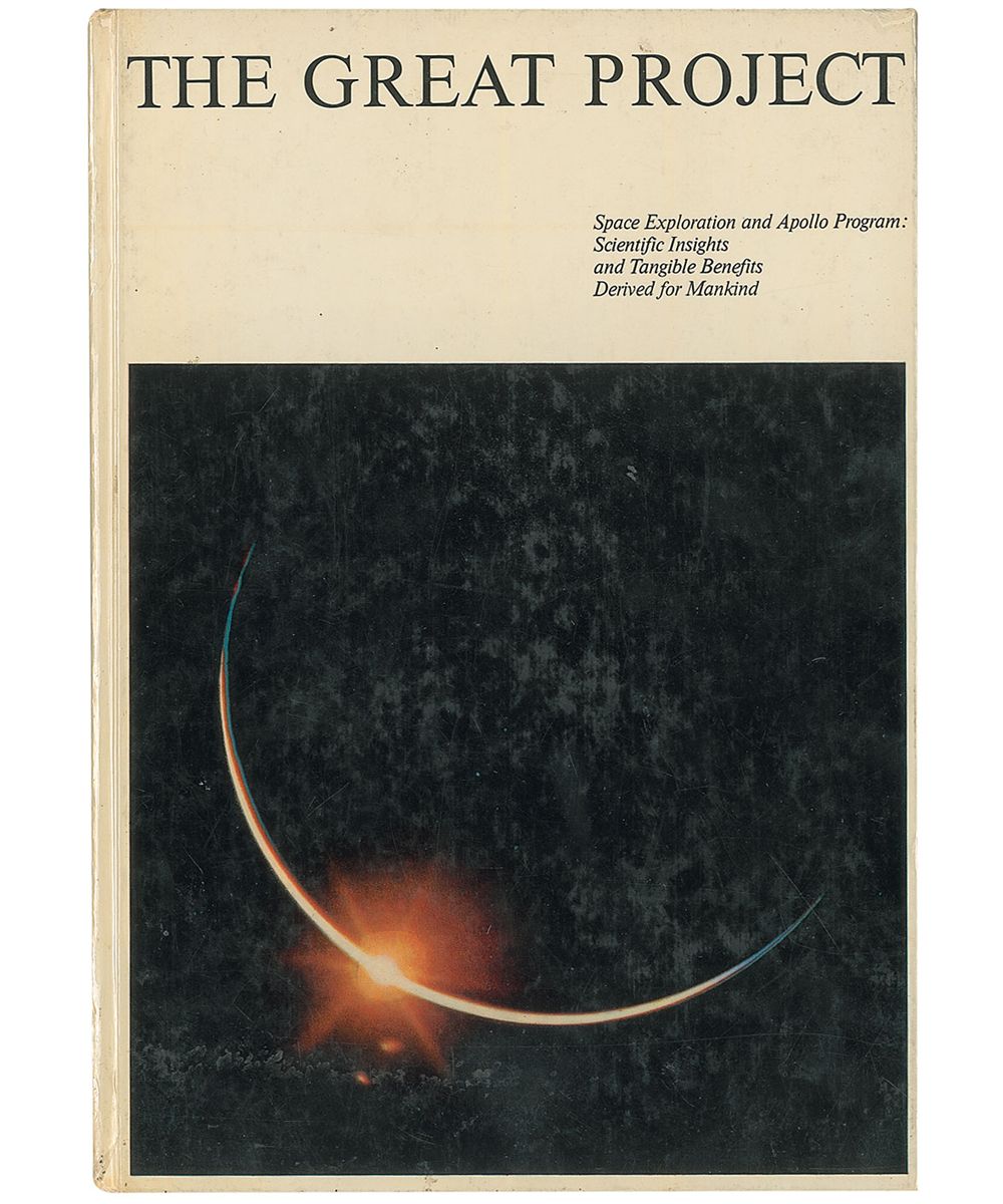 Signed book: The Great Project. Oberkochen, West Germany: Carl Zeiss, 1971. Hardcover, 8.25 x 12, 140 pages. Signed and inscribed on the front pastedown in black felt tip, “To Chuck & Barbara, With best wishes, Bill Anders, Apollo 8.” Autographic condition: fine. Book condition: VG/None. Illustrated glossy paper-covered boards; exterior and margins of textblock yellowed; mild wear to edges; small piece of the paper’s glossy laminate beginning to peel at spinetail. Accompanied by a full letter of authenticity from PSA/DNA.