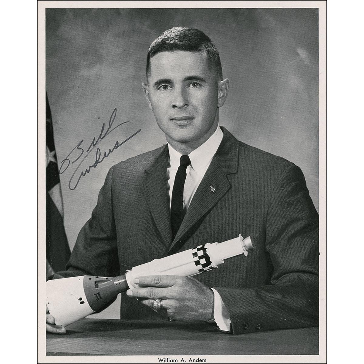 Early 8 x 10 cardstock photo of Anders dressed in a jacket and tie and holding a model rocket, signed in black felt tip. In fine condition, with a small surface ding and a few scattered surface flaws.