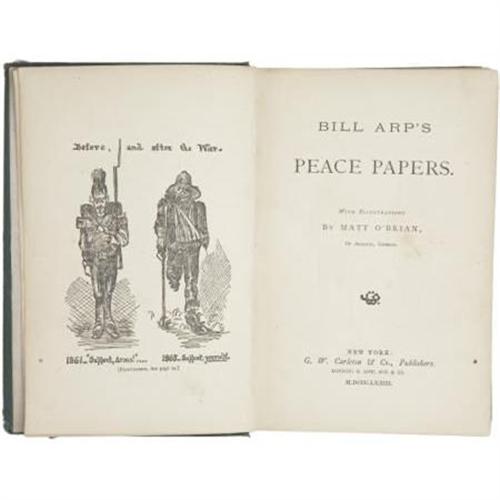 <B>Bill Arp [pseudonym of Charles Henry Smith]. </B></I><B><I>Bill Arp's Peace Papers</B></I></B></I><B>.</B></I> New York: G. W. Carleton & Co., 1873.<BR> <BR>First edition. Twelvemo. 271 pages. Thirty-six illustrations in text by Mat O'Brian. <BR><BR>Original green cloth with decoration and rules stamped in blind on the boards. Titles in gilt on the spine. Small area of loss at the head of the spine. Foot of spine frayed. Corners bumped and abraded. Scuffing and soiling to boards. Contents toned, else sound. Good condition.<BR><BR><BR><b>Shipping:</b> Books & Catalogs (<a target="_blank" href="http://www.heritageauctions.com/common/shipping.php">view shipping information</a>)