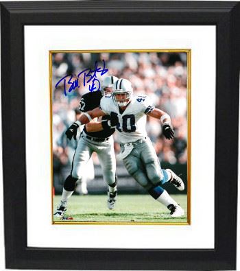 Bill Bates was a long shot to make the Dallas Cowboys but his heart and hustle earned him a roster spot on the team and a place in the hearts of all Cowboy fans. From the start he excelled playing special teams, being named “NFC special teams Player of the Year” as a rookie. In 1984 he was selected to the Pro Bowl in just his second year. He received the team’s Bob Lilly Award four consecutive seasons from 1990 to 1994. This award is selected by a vote of the fans and annually goes to the Cowboy player who displays leadership and character on and off the field. He played for the Cowboys for 15 seasons, earning 3 Super Bowl rings. Upon his retirement after the 1997 season, he was one of the most beloved Cowboys of all time. Over his 15 year career, Bill had 14 interceptions and 122 return yards. Bill Bates has hand signed this Dallas Cowboys 8x10 Photo. Certificate of Authenticity from Athlon Sports. Custom White Mat and Premium Black Frame as shown.