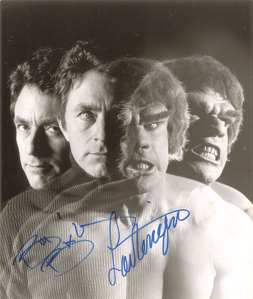 Glossy 8 x 9.5 photo of David Banner gradually changing into the Incredible Hulk, signed in blue felt tip by both Bill Bixby and Lou Ferrigno. In fine condition. From the Harvey and Rhoda Kuflik Collection. Pre-certified PSA/DNA.