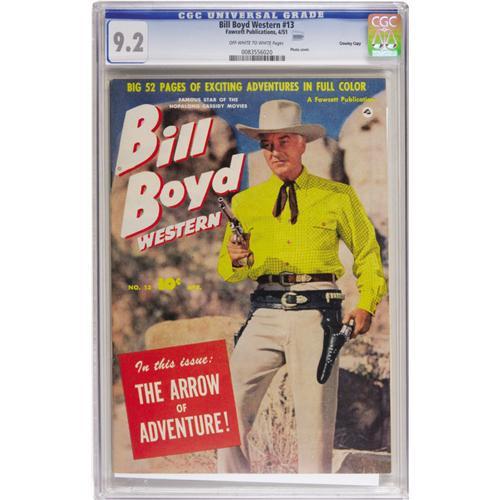 <B>Bill Boyd Western #13 Crowley Copy pedigree (Fawcett, 1951) CGC NM- 9.2 Off-white to white pages.</B></I> Photo cover. Please note that a small plastic stabilizing peg has broken loose from the CGC holder. This does not affect the comics or the integrity of the holder. The only CGC-graded copy to date. Overstreet 2006 NM- 9.2 value = $145. CGC census 10/06: 1 in 9.2, none higher.<BR><BR><b>Shipping:</b> Slabbed Comic (<a target="_blank" href="http://www.heritageauctions.com/common/shipping.php">view shipping information</a>)