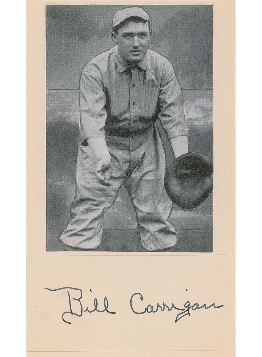 Boston Red Sox catcher and manager (1883–1969) known for catching for Cy Young and leading the team to back-to-back World Series titles in 1915 and 1916. Fountain pen signature, “Bill Carrigan,” on an off-white 3.5 x 1.5 slip affixed to a larger 3.5 x 6 card bearing an affixed image. In fine condition.