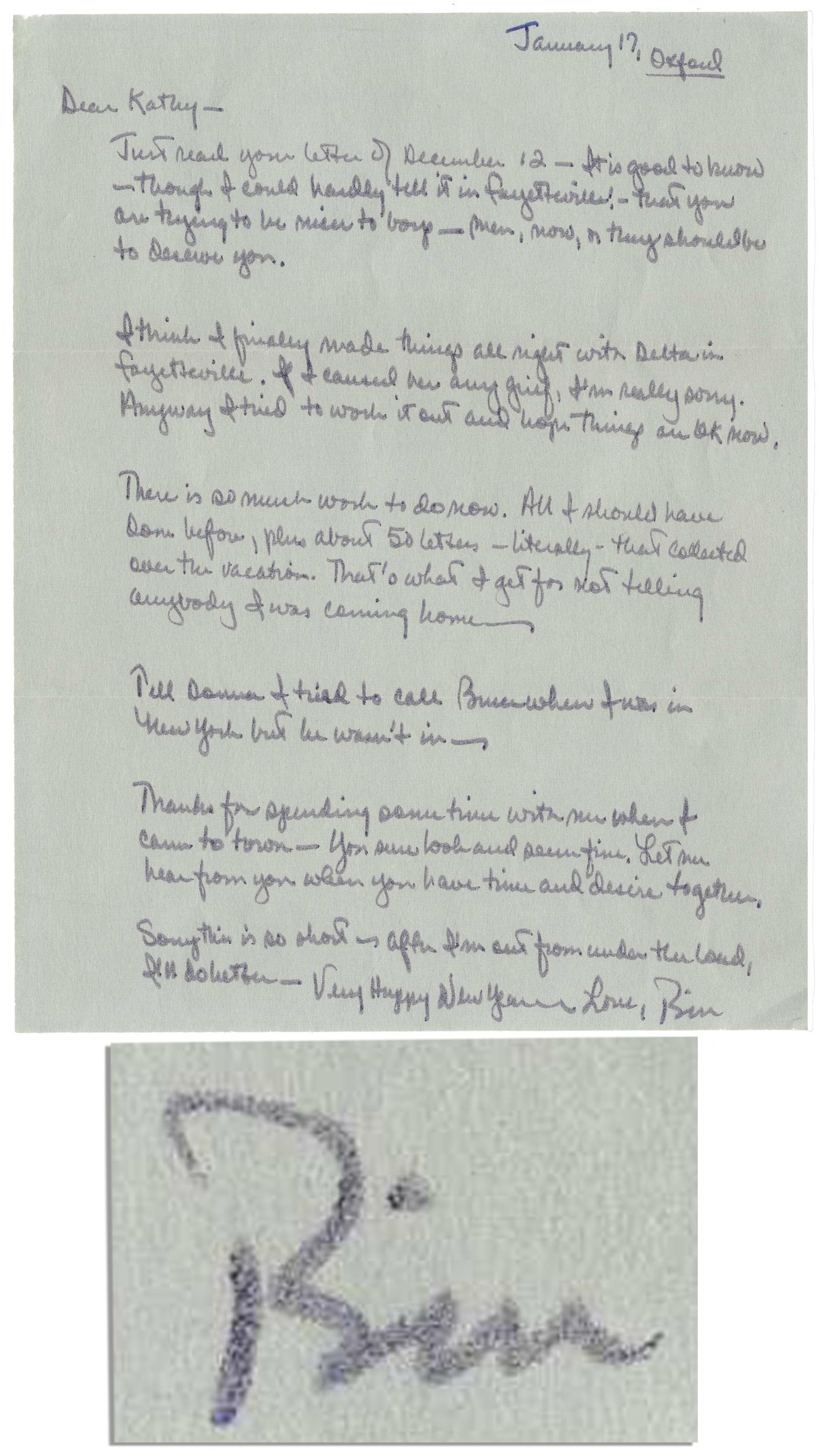 Bill Clinton autograph letter signed, dated 17 January from Oxford, England with no year, though original postmarked envelope is dated 1968, when he studied at Oxford as a Rhodes Scholar. Letter is addressed to a Kathy in Arkansas and reads in part: ''…I could hardly tell it in Fayetteville -- that you are trying to be nice to boys…I think I finally made things alright with Delta in Fayetteville. If I caused her any grief, I'm really sorry…hope things are OK now…Love, Bill''. Letter measures 7'' x 9'' on one page. Near fine.