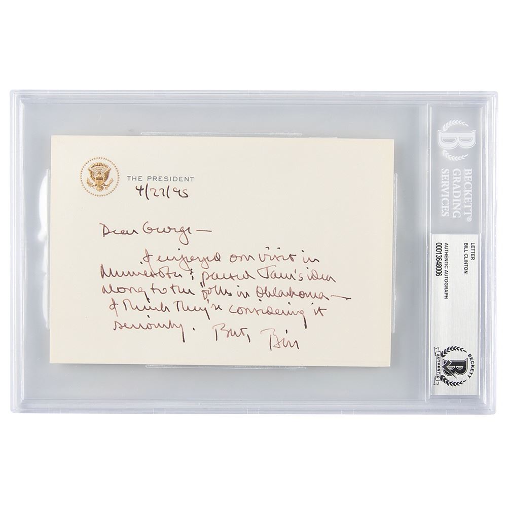 ALS as president signed “Bill,†one page, 6.25 x 4.25, embossed The President letterhead, April 27, 1995. Handwritten letter to "George," in full: "I enjoyed our visit in Minnesota & passed Tom’s idea along to the folks in Oklahoma—I think they're considering it seriously." In fine condition. Encapsulated in a Beckett authentication holder.