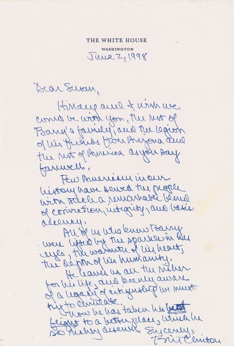 ALS as president, one page, 6.25 x 9.25, White House letterhead, June 2, 1998. Letter to the widow of Barry Goldwater, Susan Wechsler Goldwater, offering condolences on the death of the famed 1964 Republican presidential candidate. In full: “Hillary and I wish we could be with you, the rest of Barry’s family, and the legion of his friends from Arizona and the rest of America as you say farewell. Few Americans in our history have served the people with such a remarkable blend of conviction, integrity and basic decency. All of us who knew Barry were lifted by the sparkle in his eyes, the warmth of his heart, the depth of his humanity. He leaves us all the richer for his life, and keenly aware of a legacy of citizenship we must try to emulate. Now he has taken his best flight to a better place, which he so richly deserves.” In fine condition, with three unobtrusive faint stains to right edge, affecting nothing.