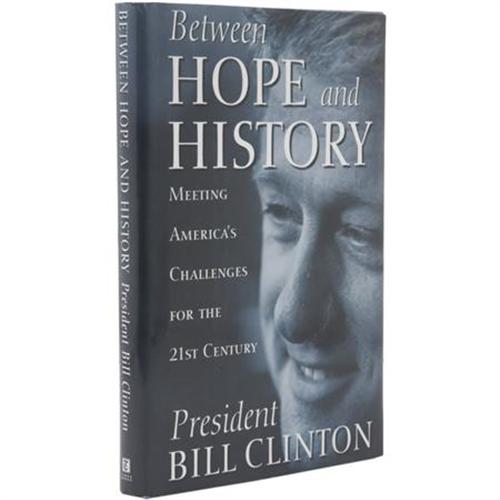 <B>Bill Clinton. </B></I><B><I>Between Hope and History: Meeting America's Challenges for the 21st Century</B></I></B></I><B>.</B></I> New York: Times Books, 1996.<BR> <BR>First edition. Signed by the author on an autograph label attached to the front free endpaper. Octavo. 178 pages.<BR><BR>Blue paper over boards and blue cloth back strip with titles in silver on the spine. Red remainder mark on the top edge. Dust jacket. Fine.<BR><BR><BR><b>Shipping:</b> Books & Catalogs (<a target="_blank" href="http://www.heritageauctions.com/common/shipping.php">view shipping information</a>)