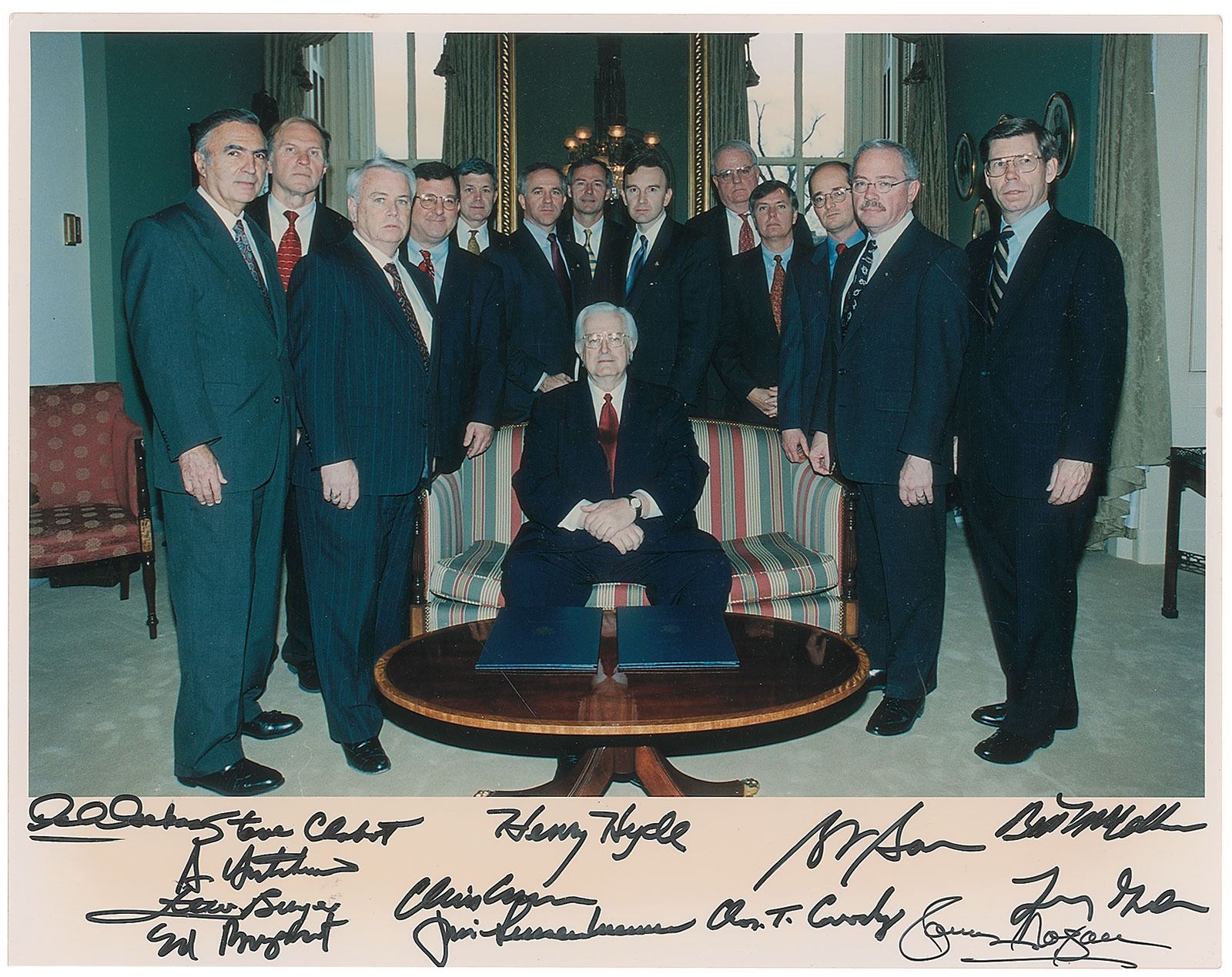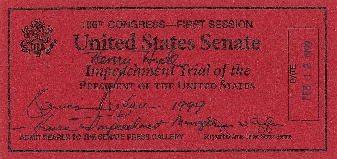 Color satin-finish 14 x 11 photo of the House managers in the impeachment trial of President Bill Clinton, signed in the lower border in black felt tip by the full committee: James E. Rogan, Henry Hyde, Asa Hutchinson, Ed Bryant, Bill McCollum, George Gekas, Steve Chabot, Bob Barr, Chris Cannon, Charles Canady, Steve Buyer, Lindsey Graham, and Jim Sensenbrenner. In fine condition. Accompanied by an official red impeachment ticket for access to the Senate press gallery on February 12, 1999, the day that the Senate acquitted Clinton of the charges to conclude the proceedings, which is signed by Hyde and Rogan. This rare image depicts the managers in the historic House Judiciary Committee hearing room shortly after the House of Representatives voted to approve the articles, which rest on a table in front of Chairman Henry Hyde.
