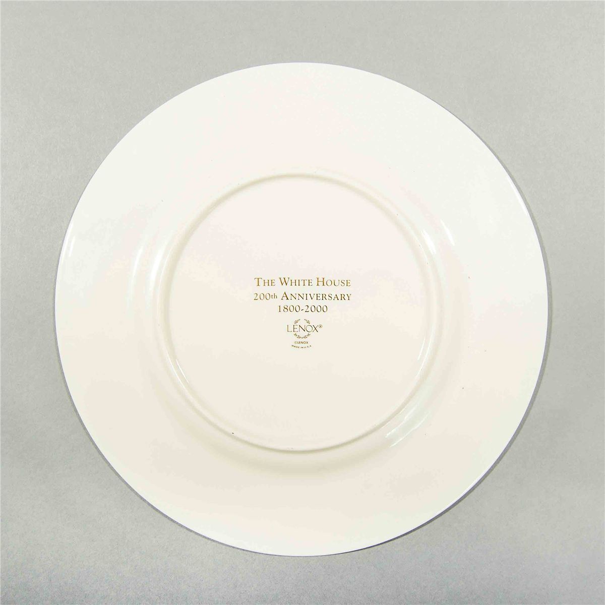 Original Bill Clinton official White House Lenox china salad plate. Plate measures 9.25? in diameter, with a decorative embossed gold border of raised flowers and laurels along the yellow rim. Bottom is marked, “The White House 200th Anniversary 1800–2000 Lenox.” In very fine condition. Each Clinton piece is of a unique border design, which can not be said about any other president’s White House china. This example was part of the 300 12-piece place settings ordered by the Clintons, an order totaling approximately $500,000. An enticing offering, as examples of official Clinton china are practically nonexistent outside of the White House.
