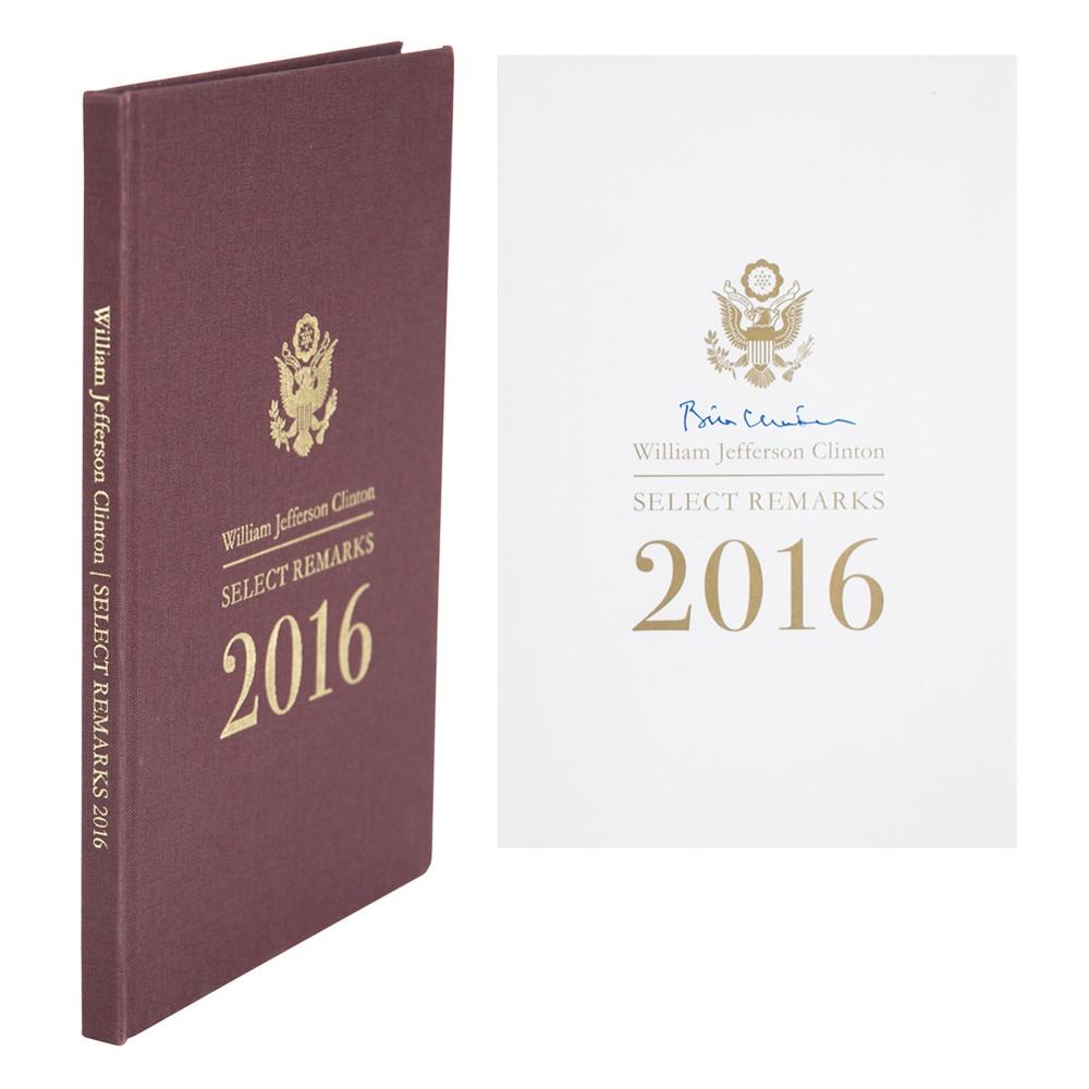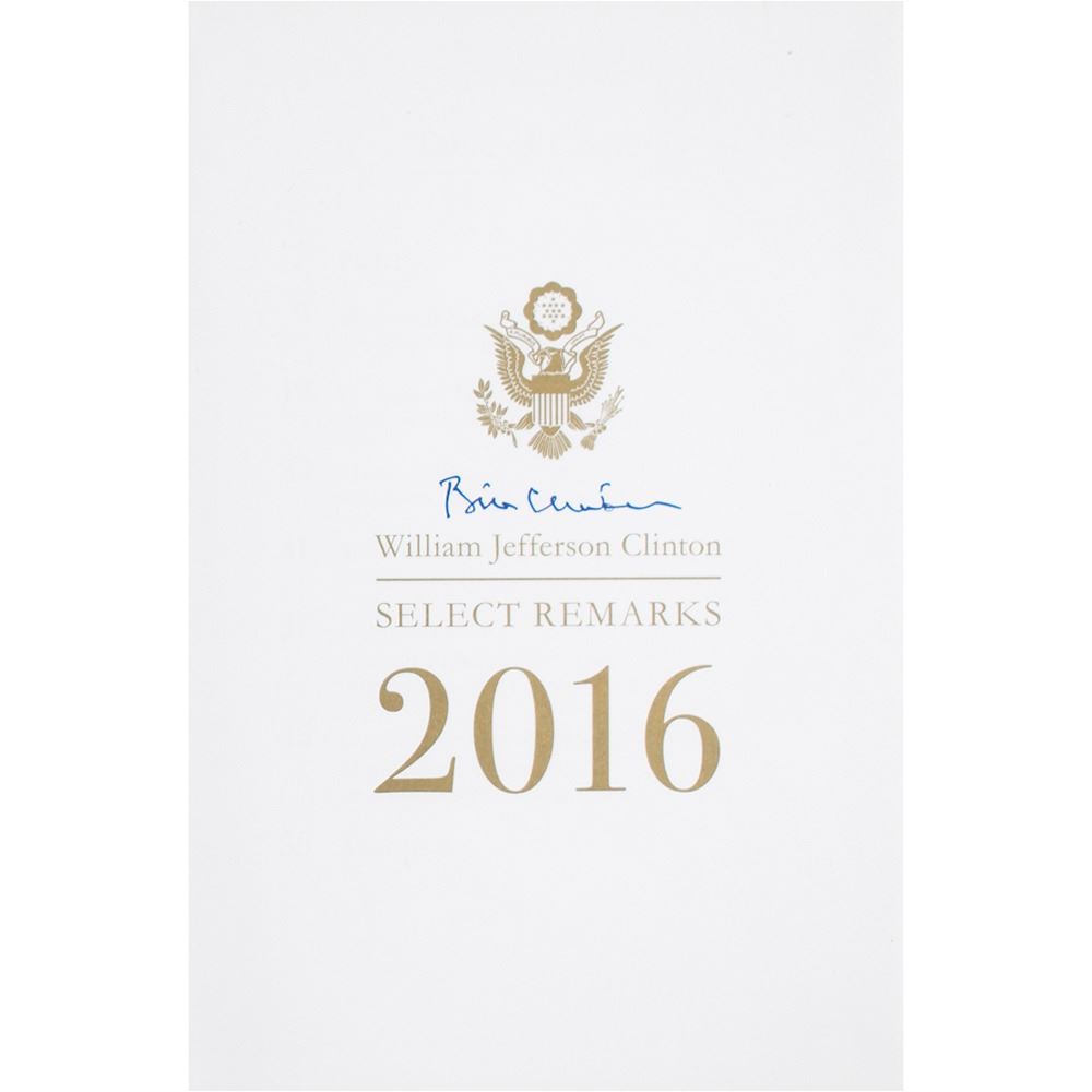 Signed book: William Jefferson Clinton: Select Remarks, 2016. NY: Clinton Foundation, 2016. Hardcover, 6 x 9.25, 57 pages. Signed on the title page in blue felt tip by Bill Clinton. In very fine condition.