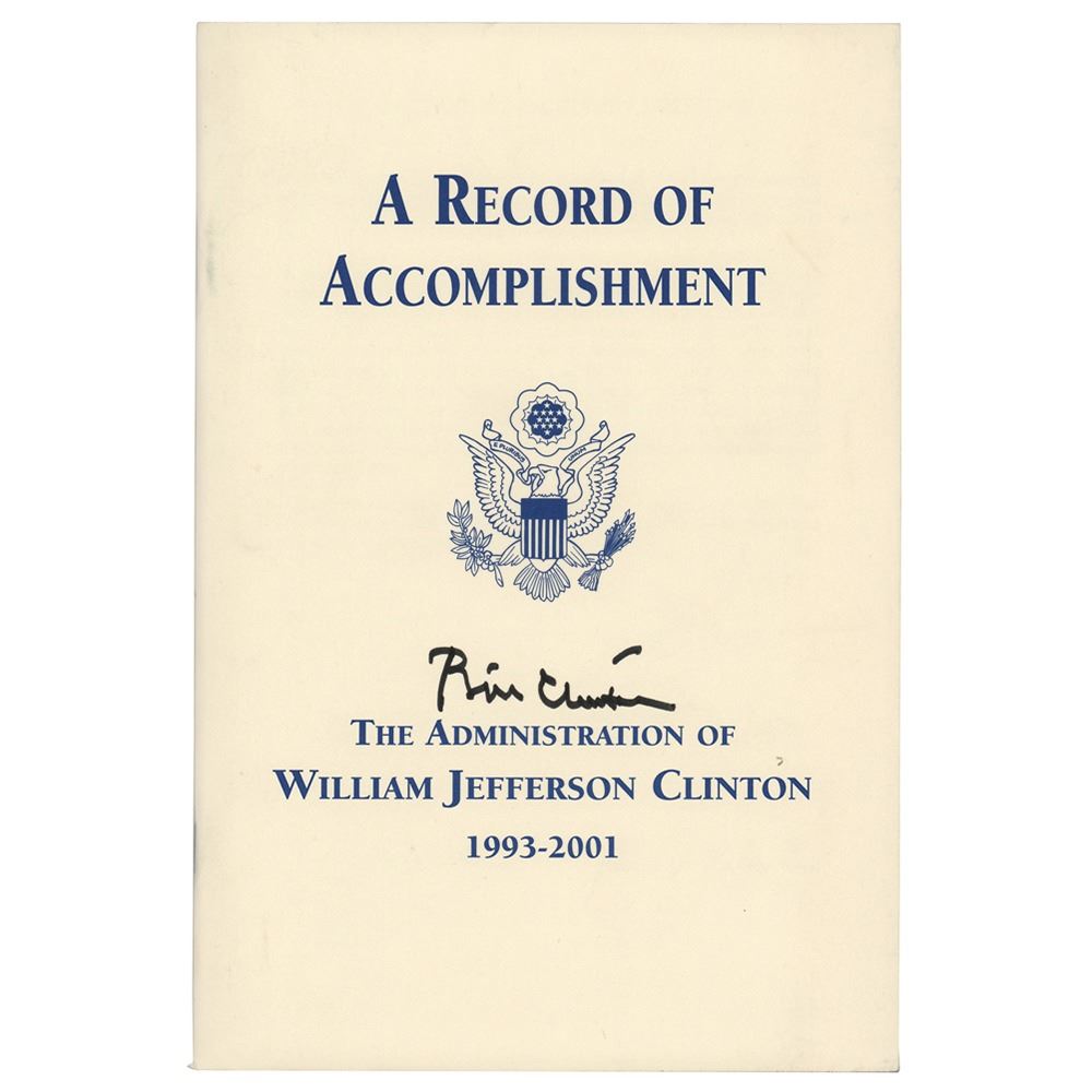 Signed book: A Record of Accomplishment: The Administration of William Jefferson Clinton, 1993–2001. Little Rock: William J. Clinton Presidential Foundation, 2001. Paperback, 6 x 9, 35 pages. Signed on the front cover in black felt tip by Bill Clinton. In fine condition, with a few ink notations inside and on the back cover.