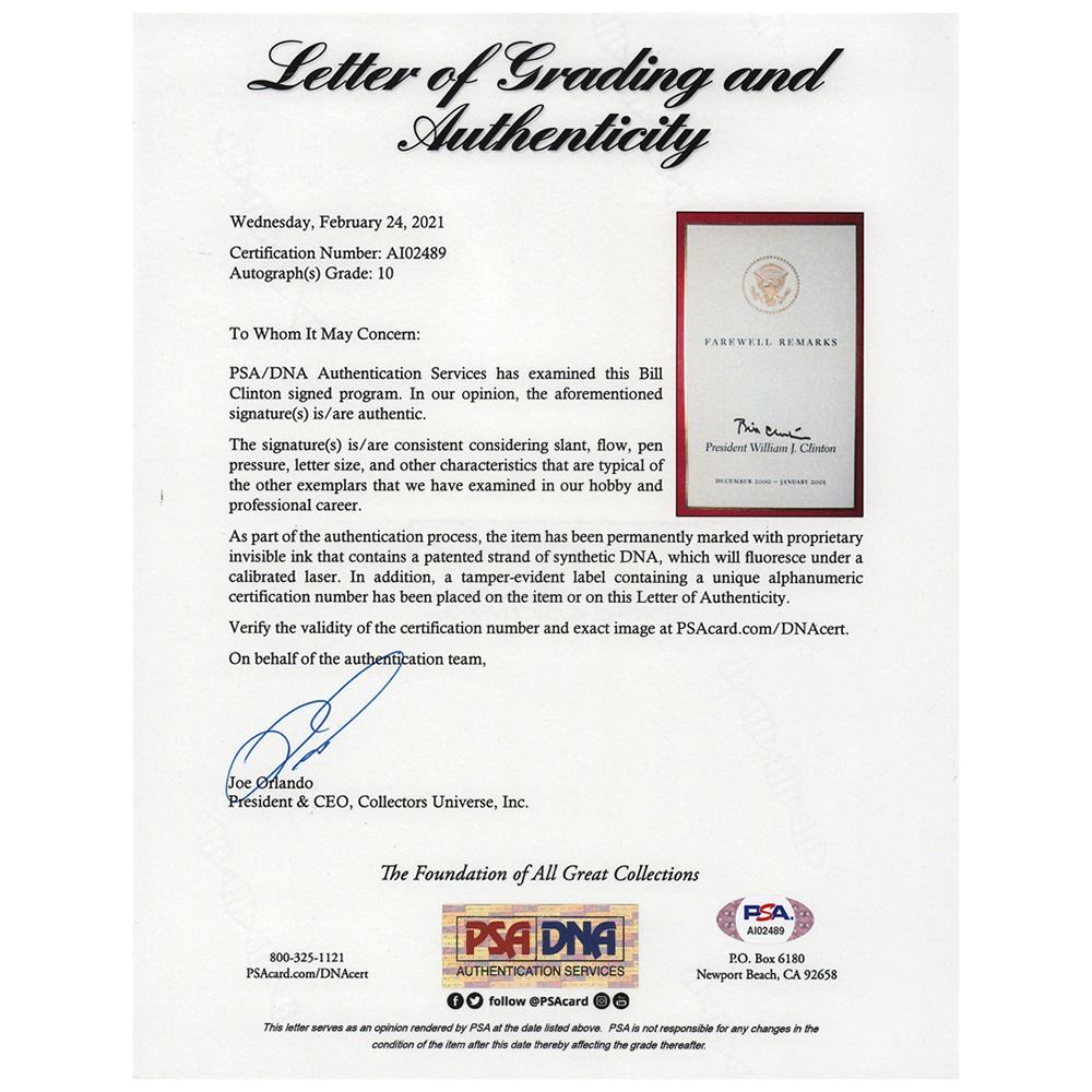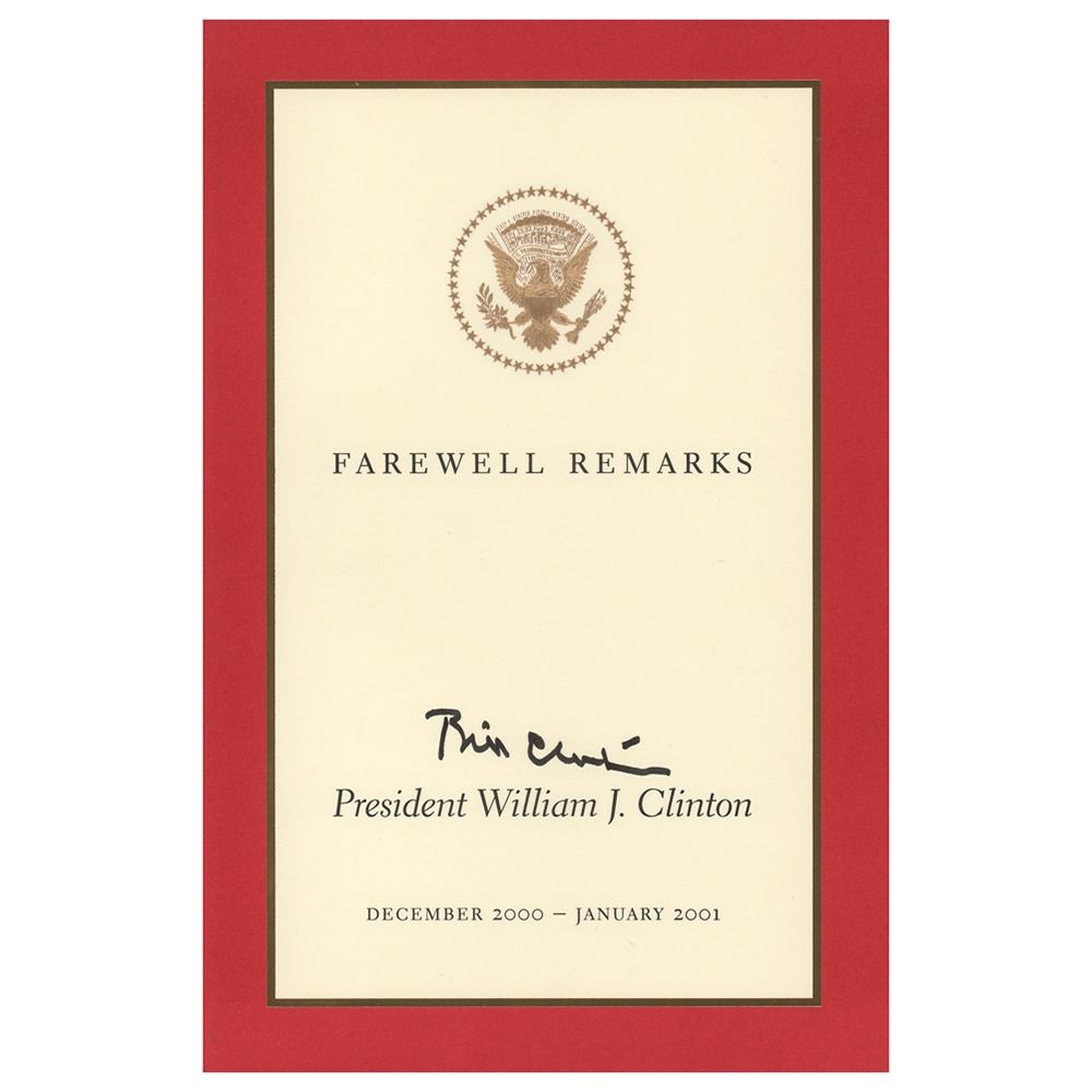 Scarce softcover booklet entitled "Farewell Remarks: President Bill Clinton, December 2000–January 2001," 36 pages, 6.5 x 10, signed on the front cover in black felt tip, "Bill Clinton." In very fine condition. Accompanied by a full letter of authenticity from PSA/DNA. This booklet was available only to close members of the campaign and top donors; it is extremely difficult to find, even in unsigned examples.