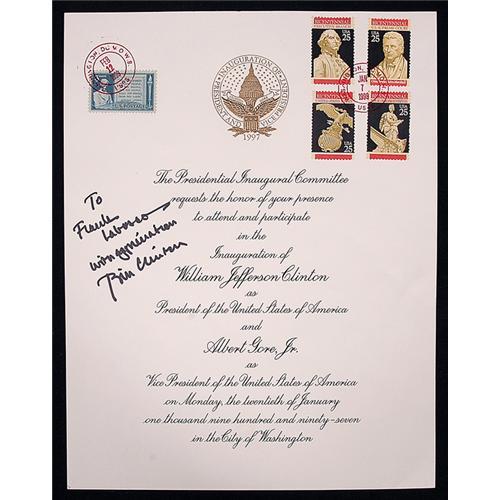 <Our item number 139846><B>Clinton, William Jefferson.</B> Official, engraved invitation to Clinton's 1997 Presidential Inauguration inscribed and signed, "To Frank Labosso with admiration Bill Clinton," 11 x 8½ in. Cancelled First-Day stamps representing the four branches of the U.S. Government are affixed at top. Accompanied by the transmittal envelope and a 1997 Commemorative Invitation. Excellent condition. <BR>Estimated Value $300 - 500. <BR><BR>Our item number 139846<BR><IMAGES><P ALIGN="CENTER"><IMG SRC="http://www.goldbergcoins.net/liveauction/49jpegs/139846.jpg"> </P></IMAGES>