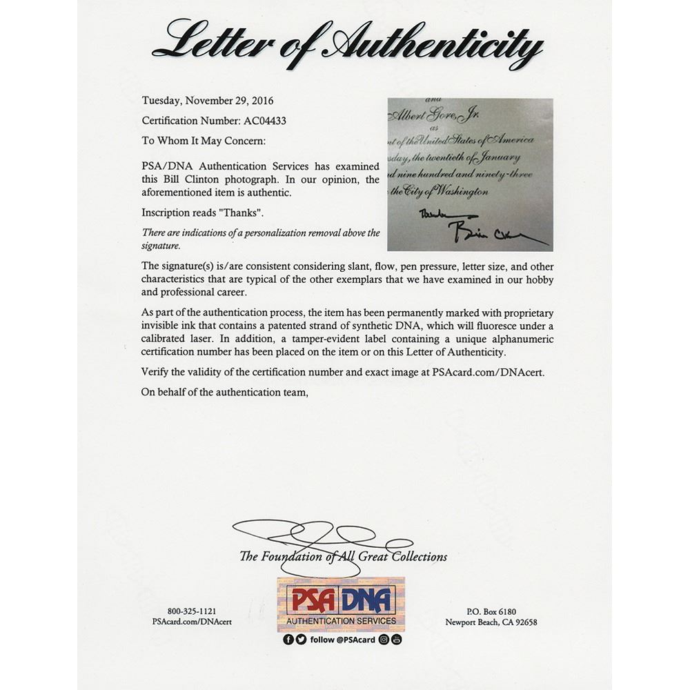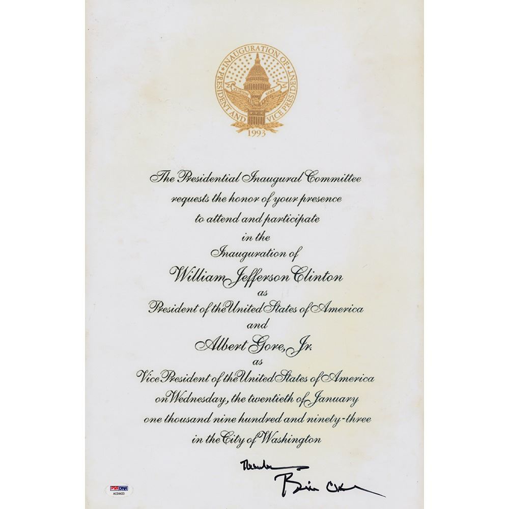Color satin-finish 12 x 18 photo reproducing an invitation to Clinton's presidential inauguration in 1993, signed in black felt tip, "Thanks, Bill Clinton." In very good to fine condition, with fuzziness to the text, small surface creases, and some areas of mild discoloration. Accompanied by a full letter of authenticity from PSA/DNA.