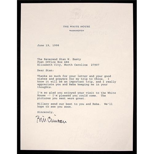 <Our item number 140698><B>Clinton, William Jefferson.</B> Typed letter signed ("Bill Clinton") as President, on "The White House" letterhead, 1p, 9 x 6¾ in., Washington, 19 June 1998. To the Reverend Stan W. Easty, thanking him for his letter and his "good wishes and prayers for my trip to China. I know it will be an important trip… Hillary send[s] our best to you and Reba…." Very fine. <BR>Estimated Value $400 - 600. <BR><BR>Our item number 140698<BR><IMAGES><P ALIGN="CENTER"><IMG SRC="http://www.goldbergcoins.net/liveauction/49jpegs/140698.jpg"> </P></IMAGES>