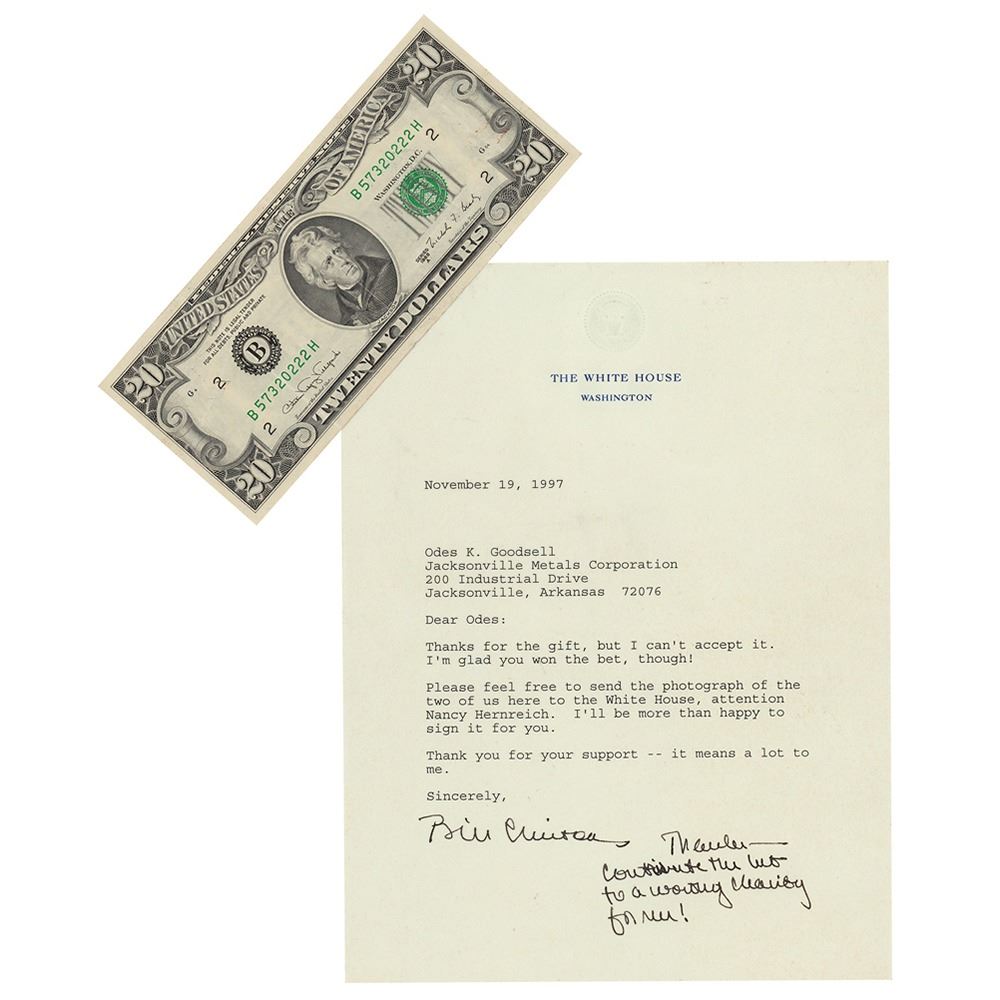 TLS as president, one page, 6.75 x 8.75, White House letterhead, November 19, 1997. Letter to autograph seeker Odes K. Goodsell, in full: "Thanks for the gift, but I can't accept it. I'm glad you won the bet, though! Please feel free to send the photograph of the two of us here to the White House, attention Nancy Hernreich. I'll be more than happy to sign it for you. Thank you for your support—it means a lot to me." Clinton adds a handwritten postscript: "Thanks—contribute the bet to a worthy charity for me!" Includes the original 20 dollar bill that Goodsell sent to the president, as well as a copy of Clinton's response with a handwritten note from the recipient in the upper left corner: "This is a copy of the twenty I gave Bill Clinton that you gave me on our bet and a copy of his letter to me. Had a lot of fun out of this." In fine condition, with two light paperclip impressions to the top edge. Accompanied by a transmittal letter from the White House to Goodsell from an earlier date, March 3, 1993, notifying him that the White House is forced to refuse autograph requests, and the original White House mailing envelope for the transmittal letter.