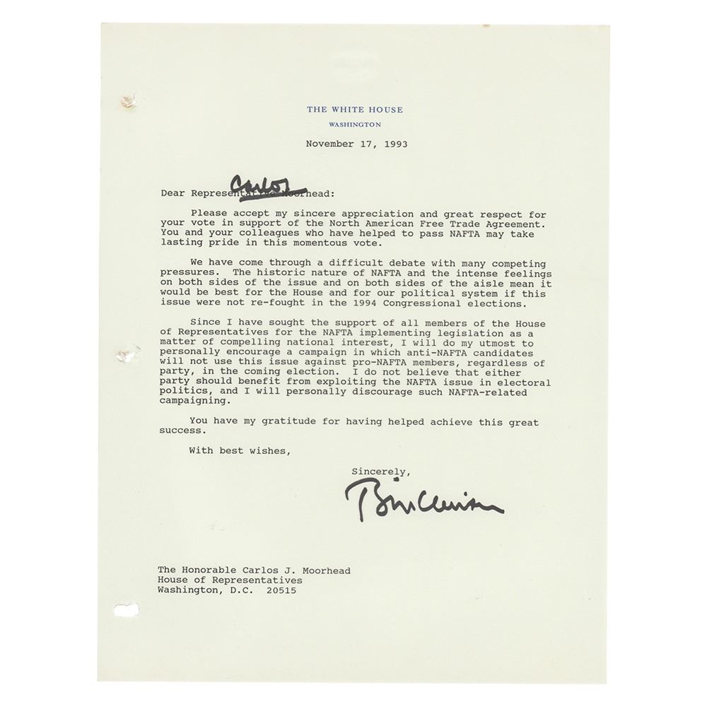 TLS as president, one page, 8.5 x 11, White House letterhead, November 17, 1993. Letter to Congressman Carlos J. Moorhead of California, in full: "Please accept my sincere appreciation and great respect for your vote in support of the North American Free Trade Agreement. You and your colleagues who have helped to pass NAFTA may take lasting pride in this momentous vote. We have come through a difficult debate with many competing pressures. The historic nature of NAFTA and the intense feelings on both sides of the issue and on both sides of the aisle mean it would be best for the House and for our political system if this issue were not re-fought in the 1994 Congressional elections. Since I have sought the support of all members of the House of Representatives for the NAFTA implementing legislation as a matter of compelling national interest, I will do my utmost to personally encourage a campaign in which anti-NAFTA candidates will not use this issue against pro-NAFTA members, regardless of party, in the coming election. I do not believe that either party should benefit from exploiting the NAFTA issue in electoral politics, and I will personally discourage such NAFTA-related campaigning. You have my gratitude for having helped achieve this great success." In fine condition, with three file holes in the left margin.