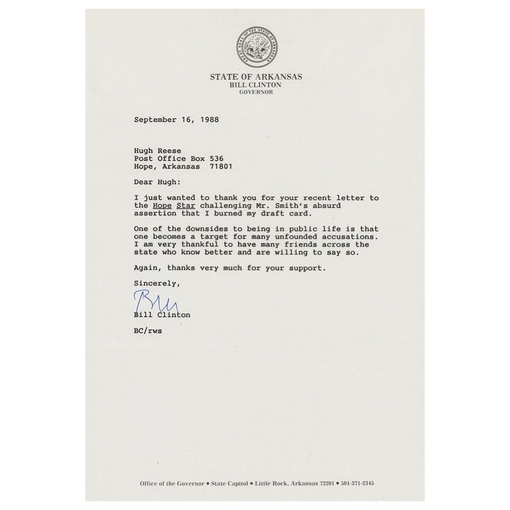 TLS signed “Bill,†one page, 7.25 x 10.5, State of Arkansas letterhead, September 16, 1988. Letter to Hugh Reese of Hope, Arkansas, in part: "I just wanted to thank you for your recent letter to the Hope Star challenging Mr. Smith's absurd assertion that I burned my draft card. One of the downsides to being in public life is that one becomes a target for many unfounded accusations. I am very thankful to have many friends across the state who know better and are willing to say so." In fine condition.