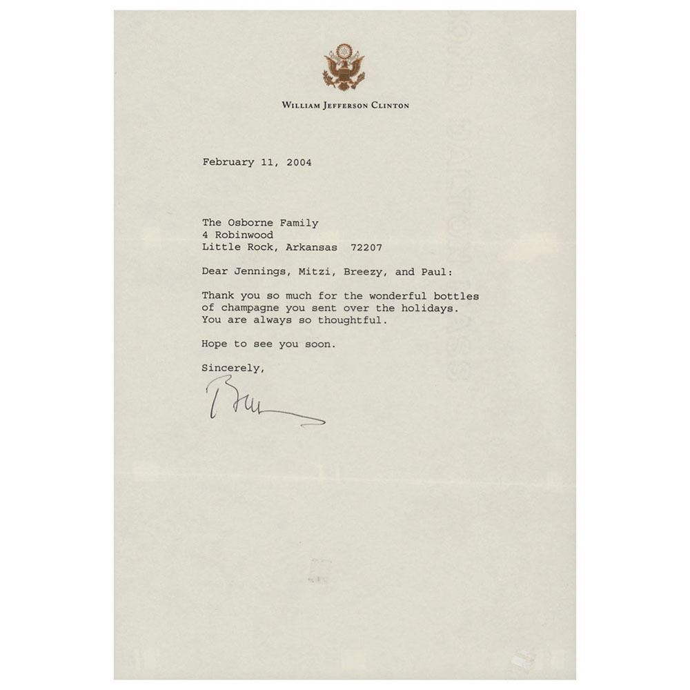 TLS signed “Bill,†one page, 7.25 x 10.5, personal letterhead, February 11, 2004. Letter to the Osborne family in Little Rock, in part: "Thank you so much for the wonderful bottles of champagne you sent over the holidays. You are always so thoughtful." In fine condition, with several small pieces of adhesive on the back (and one piece at lower right corner), resulting in some show-through. Accompanied by the original mailing envelope bearing a pre-printed free frank.