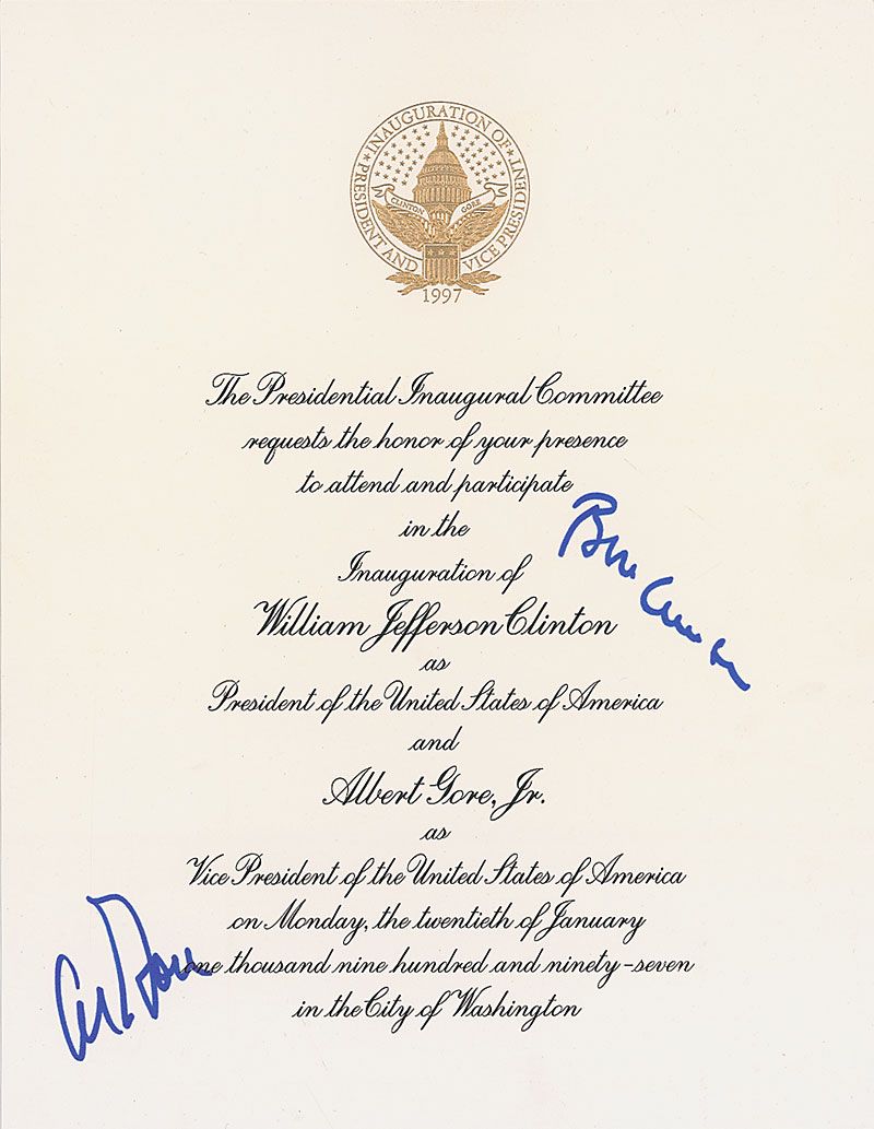 Very nice embossed invitation to the 1997 inauguration of Bill Clinton and Al Gore, 8.5 x 11, signed in blue felt tip by both Clinton and Gore. In very fine condition.