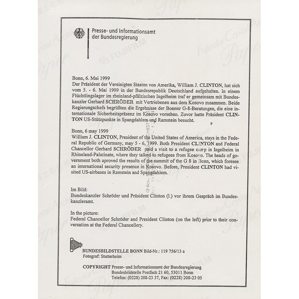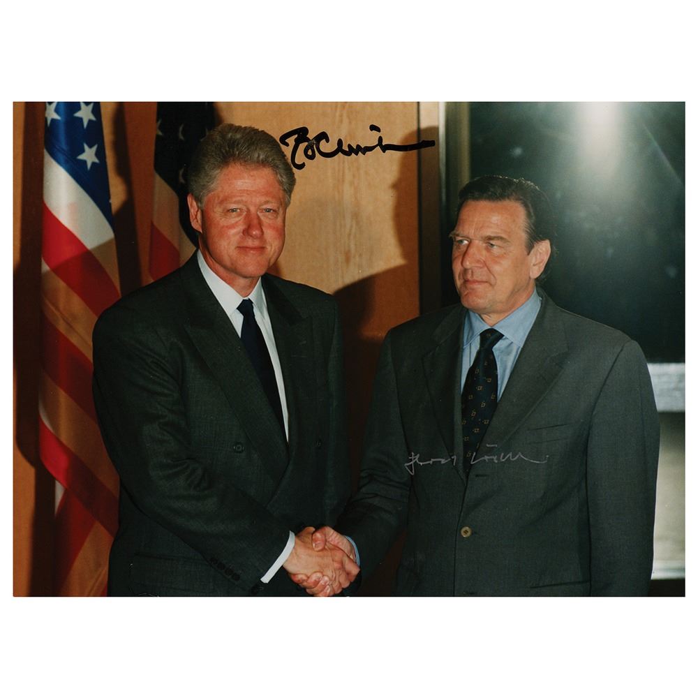 Color glossy 9.25 x 7 photo of President Bill Clinton and German Chancellor Gerhard Schroder shaking hands after they spoke at the Chancellery in Bonn on May 6, 1999, signed in black felt tip by Clinton and in silver ink by Schroder. Reverse bears German and English information text. In fine condition.