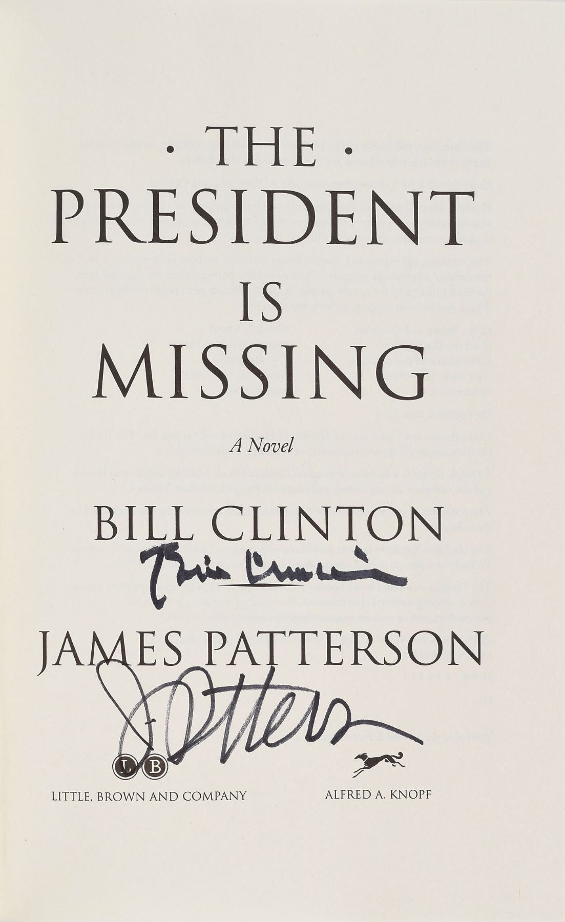 Signed book: The President Is Missing. First edition. NY: Little, Brown and Company / Alfred A. Knopf, 2018. Hardcover with dust jacket, 6.25 x 9.5, 513 pages. Signed on the title page in black felt tip, "Bill Clinton" and "J. Patterson." In very fine condition. Accompanied by a flyer for a Clinton and Patterson book signing at Barnes & Noble Fifth Avenue on June 5, 2018. A desirable example representing the first instance in which a former president and one of the most popular American novelists have co-authored a work of fiction.
