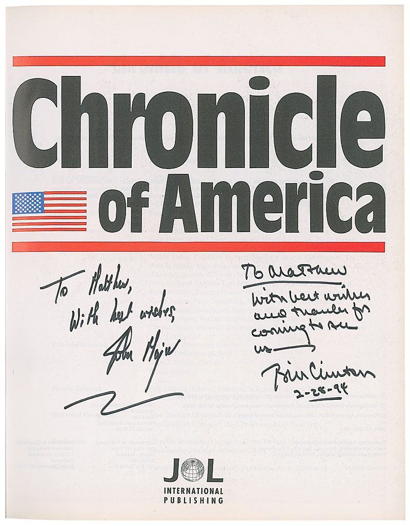 Signed book: Chronicle of America. Later printing. Missouri: JL Publishing, 1993. Hardcover with dust jacket, 9.5 x 12, 984 pages. Signed and inscribed on the title page in black felt tip, as president, “To Matthew, with best wishes and thanks for coming to see us, Bill Clinton, 2-28-94,” and “To Matthew, with best wishes, John Major.” In fine condition. Consignor notes that this book was signed in person in Pittsburgh on February 28, 1994.