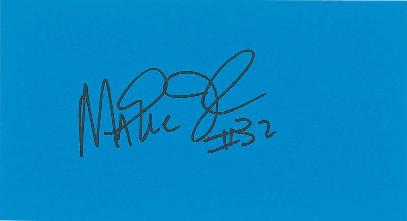 Two black felt tip signatures, “Bill Clinton” and “Magic Johnson #32,” on individual blue cards, each approximately 7.5 x 4.5. In fine condition. Consignor notes that these were signed at a campaign event in Davenport, Iowa, on December 18, 2007. Accompanied by a newspaper detailing the event and letter of provenance from the consignor.