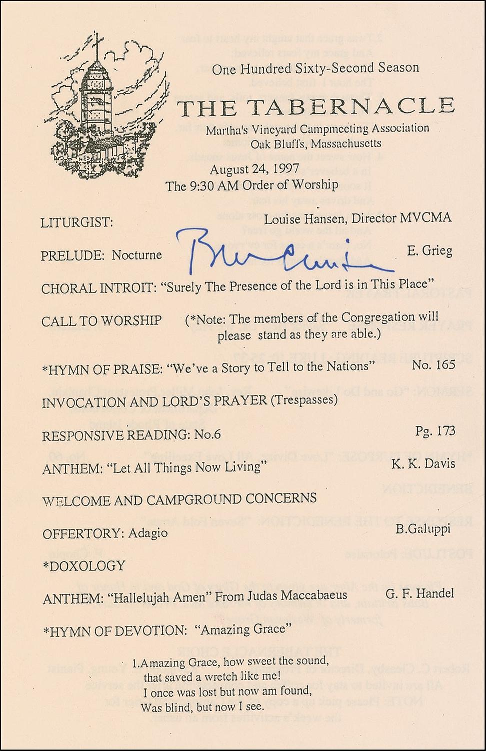 Double-sided church program, 5.5 x 8.5, for the 9:30 a.m. services held on August 24, 1997, at The Tabernacle, at Martha’s Vineyard in Massachusetts, signed on the front in blue ink, as president. In fine condition, with some mild handling wear. The Clintons attended services here while on their summer vacation at Martha’s Vineyard.