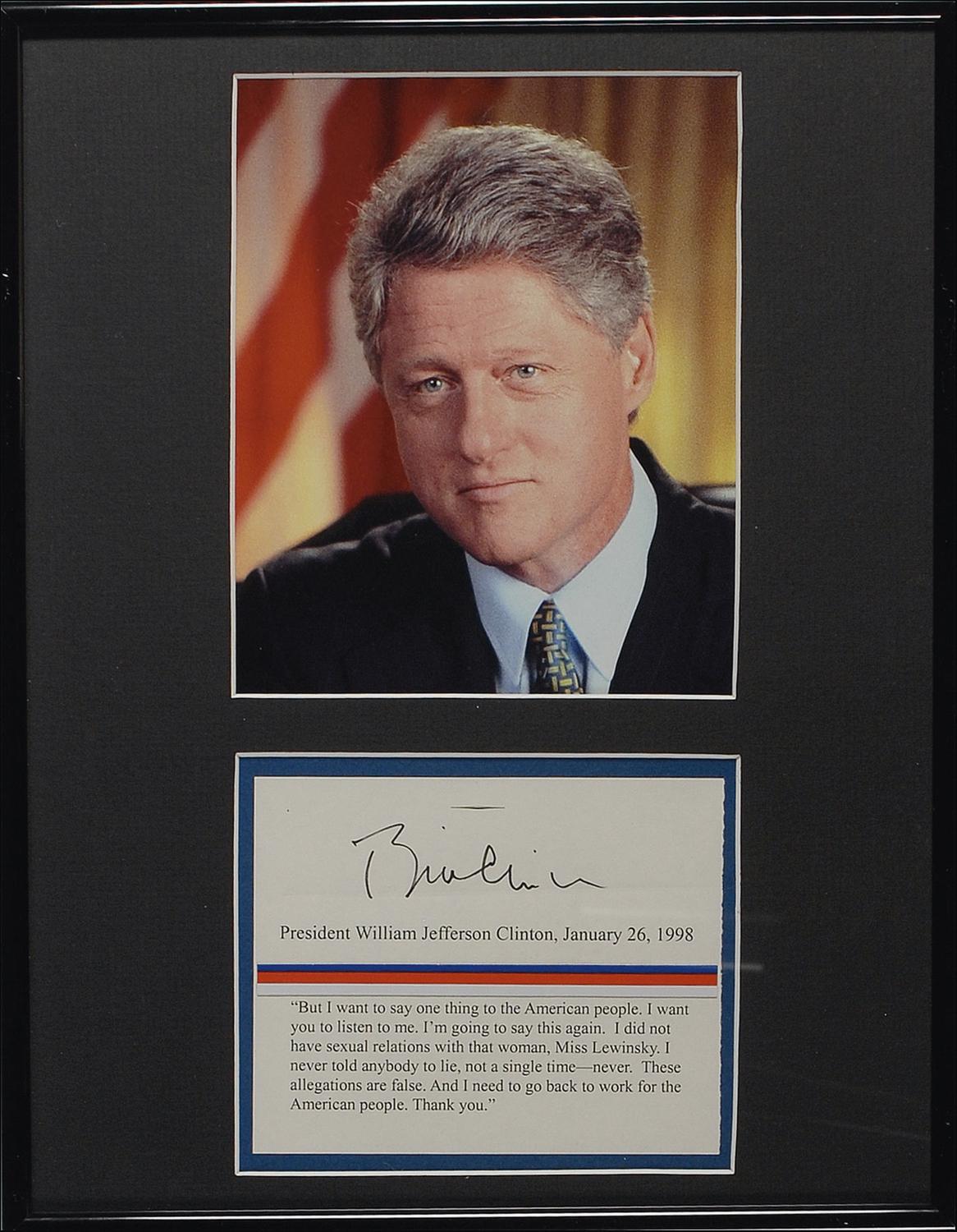 Black felt tip signature, “Bill Clinton,” on an off-white 5.5 x 4.25 sheet to which was later added a quotation from Clinton’s speech of January 26, 1998, regarding his affair with Monica Lewinsky, which reads, in part: “I want you to listen to me. I’m going to say this again. I did not have sexual relations with that woman, Miss Lewinsky. I never told anybody to lie, not a single time—never,” and a patriotically colored cardstock stripe. The sheet has been affixed to a slightly larger card. Matted and framed with a color portrait of Clinton to an overall size of 11 x 14. A few light creases (one just touching bottom edge of signature), otherwise fine condition.
