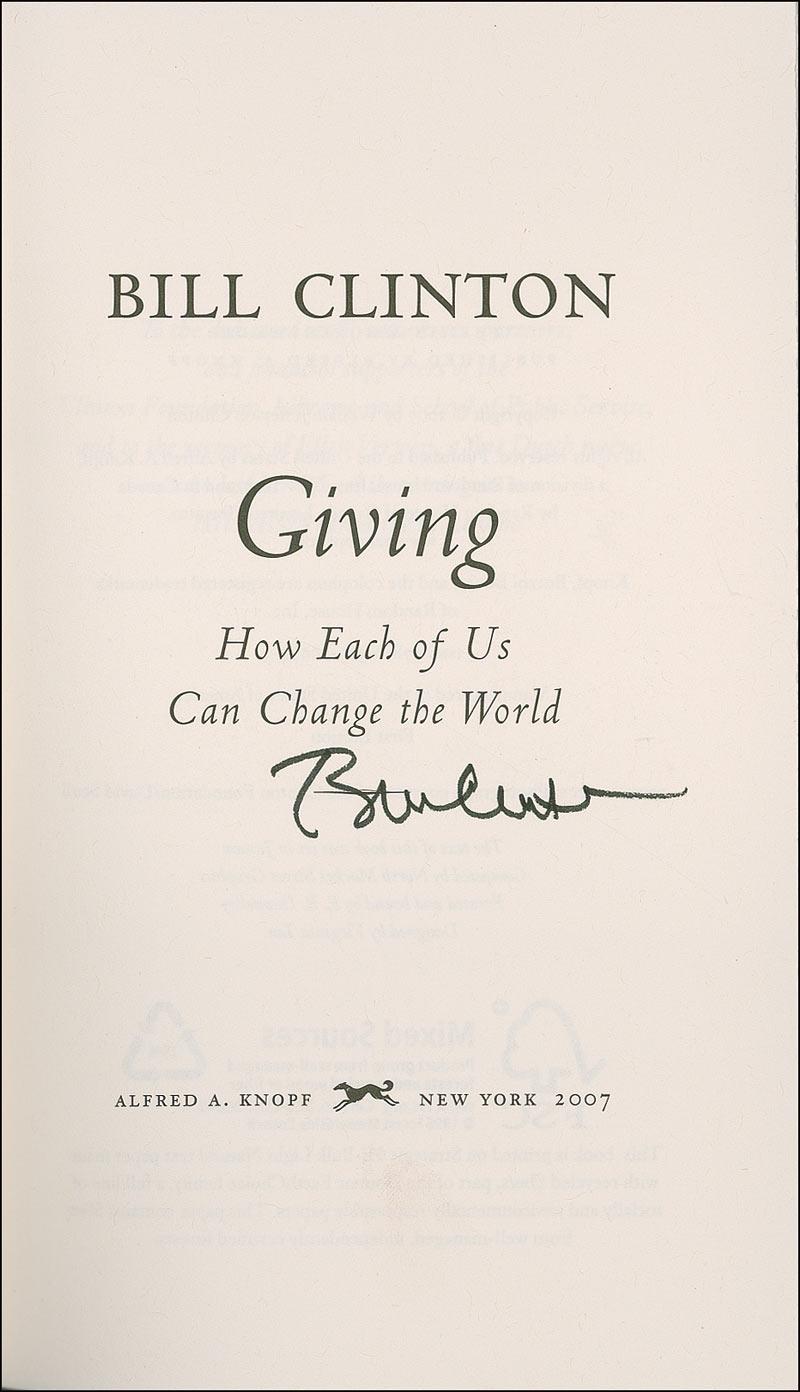 Signed book: Giving. First edition, first printing. NY: Alfred A. Knopf, 2007. Hardcover with dustjacket, 6 x 9.5, 240 pages. Signed in black felt tip, “Bill Clinton,” on the title page. In fine condition. Accompanied by a full letter of authenticity from PSA/DNA.