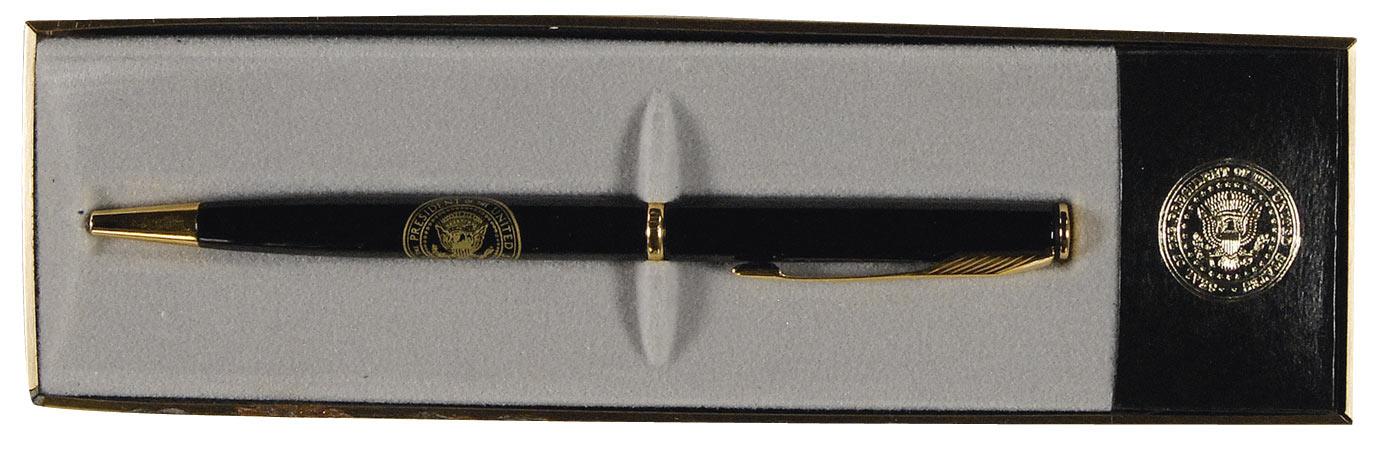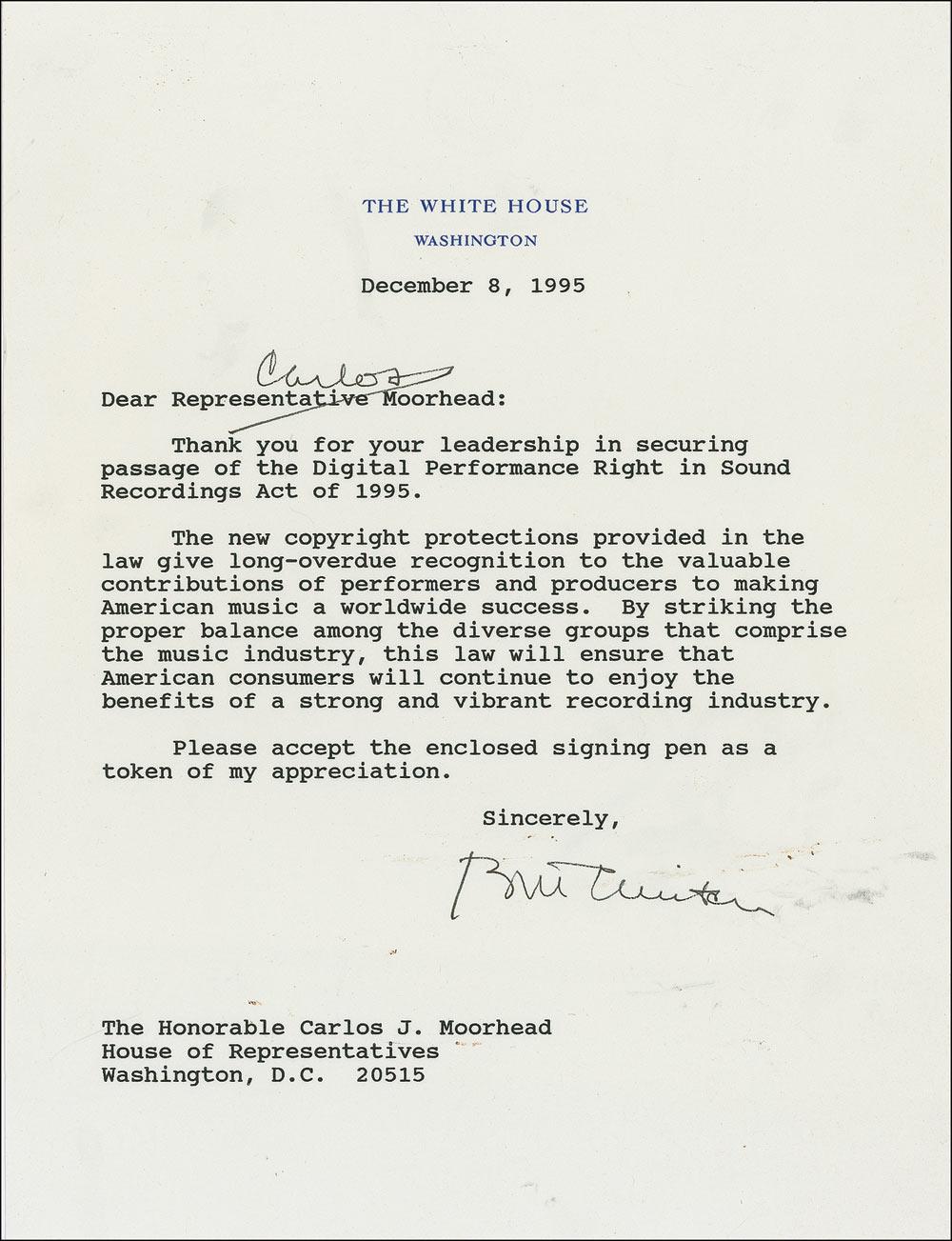 TLS as president, one page, 6.75 x 9, pale green White House letterhead, December 8, 1995. Letter to US representative Carlos Moorhead. In full: “Thank you for your leadership in securing passage of the Digital performance Right in Sound Recordings Act of 1995. The new copyright protections provided in the law give long-overdue recognition to the valuable contributions of performers and producers to making American music a worldwide success. By striking the proper balance among the diverse groups that comprise the music industry, this law will ensure that American consumers will continue to enjoy the benefits of a strong and vibrant recording industry. Please accept the enclosed signing pen as a token of my appreciation.” Accompanied by the aforementioned pen, a Parker Insignia retractable ballpoint pen (in its original box), with the seal of the president of the United States and Clinton’s facsimile signature on the pen. In fine condition, with scattered soiling to lower portion of letter, some approaching signature, as well as a couple of light creases. Accompanied by the original mailing envelope.