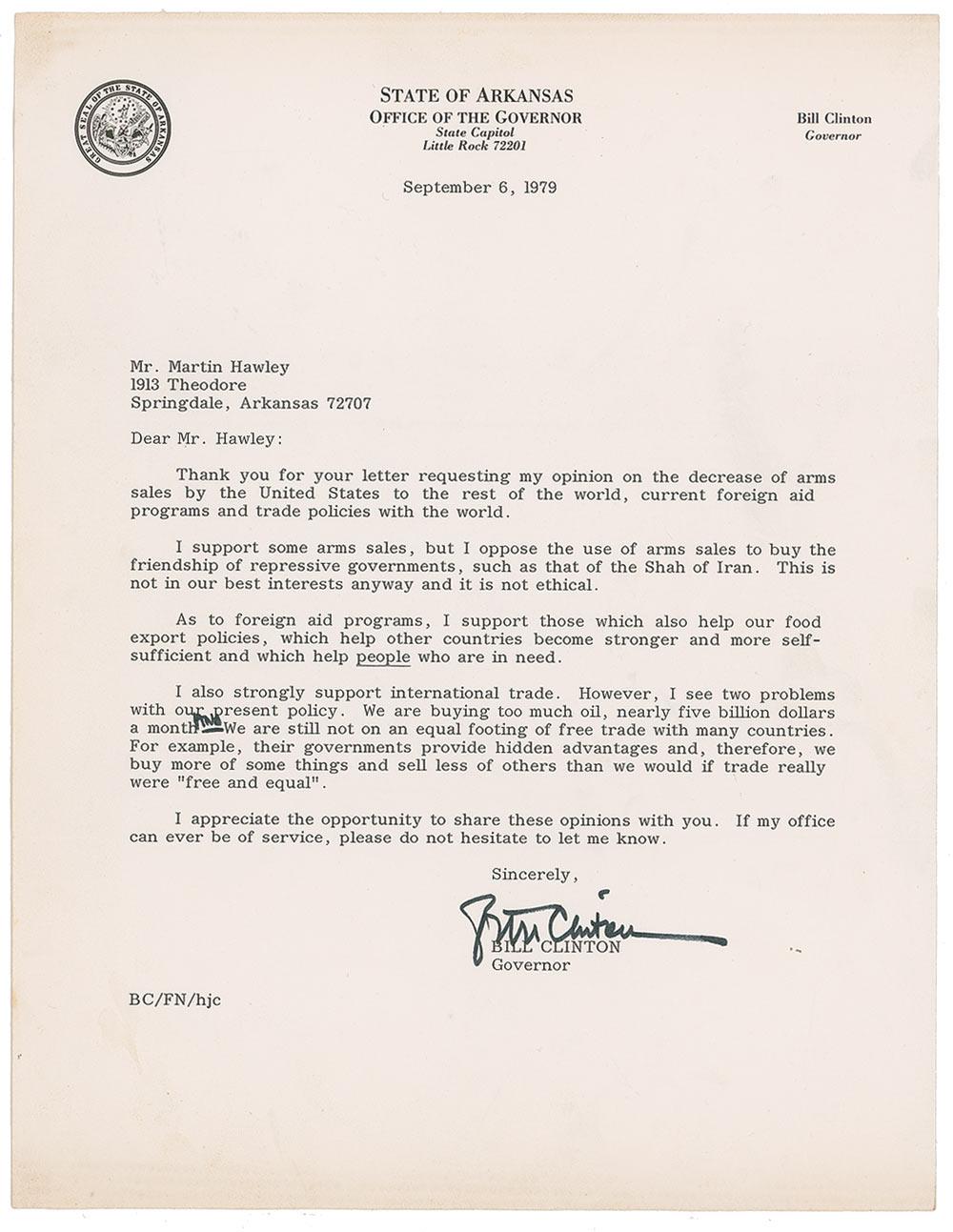 TLS, one page, 8.5 x 11, State of Arkansas, Office of the Governor letterhead, September 6, 1979. Letter to a constituent regarding foreign policy. In part, “I support arms sales, but I oppose the use of arms sales to buy the friendship of repressive governments, such as that of the Shah of Iran. This is not in the best interests anyway and it is not ethical. As to foreign aid programs, I support those which also help our food export policies, which help other countries become stronger and more self sufficient and which help people who are in need. I also strongly support international trade. However, I see two problems with our present policy. We are buying too much oil…and we are still not on equal footing of free trade with many countries. For example, their governments provide hidden advantages and, therefore, we buy more of some things and sell less of others than we would if we would if trade really were ‘free and equal.’” In fine condition, with a bit of faint edge toning and a few creases.