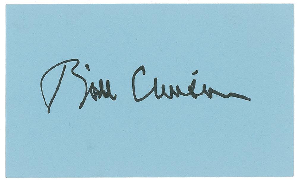 In-person felt tip signature, “Bill Clinton,” on a light blue 5 x 3 card. In very fine condition.