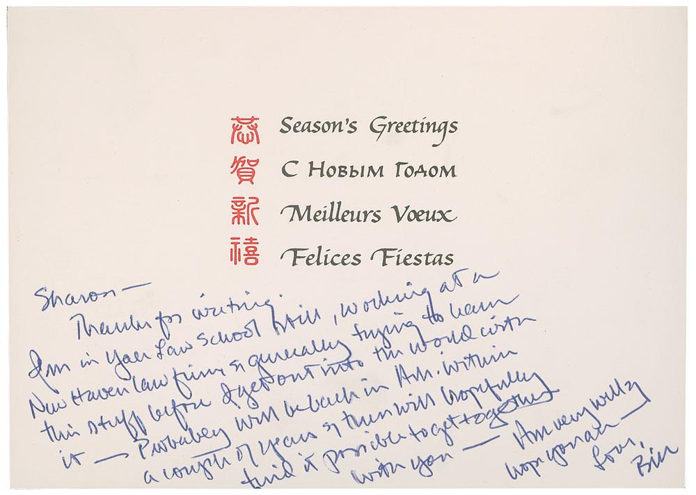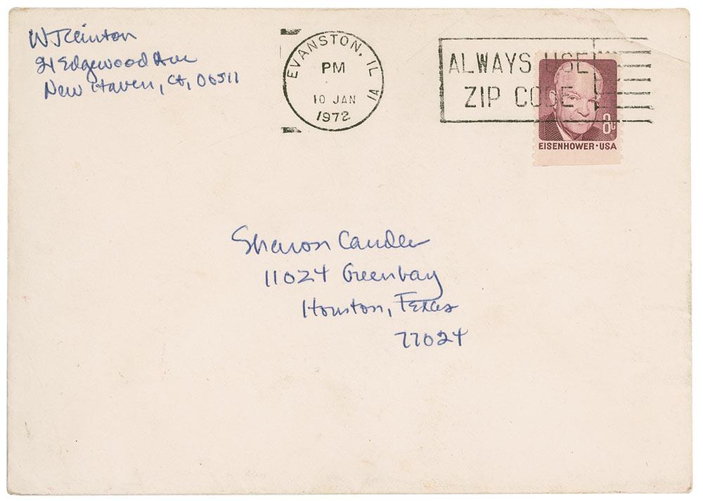 ALS signed “Love, Bill,” one page, 6 x 4.25, no date, but postmarked January 10, 1972. Letter to Sharon Caudle, written inside a UNICEF greeting card picturing the work ‘Ride, My Little One,’ on the cover. Clinton writes, in full: “Thanks for writing. I am in Yale Law School still, working at a New Haven law firm & generally trying to learn this stuff before I get out into the world with it—Probably will be back in Ark. within a couple of years & then will hopefully find it possible to get together with you—Am very willing hope you are.” In fine condition. Accompanied by the original mailing envelope, addressed in Clinton’s hand, and signed in the return address area, “W. J. Clinton.” Clinton began dating fellow student, Hillary Rodham, in the late spring of 1971, and in the summer of that same year, went to live with her in California while she interned at the law firm Treuhaft, Walker and Burnstein.