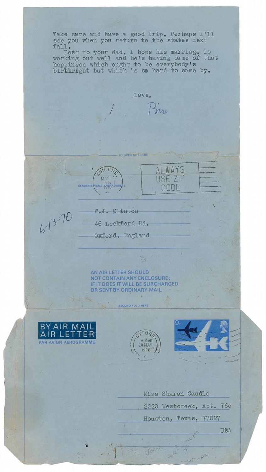 TLS signed “Bill,” one page both sides of an integral air mail envelope, 5.75 x 12.5, no date, but postmarked May 20, 1970. Letter to Sharon Caudle. In part: “Your letter arrived today, shaming me into an immediate response. I just reread your last letter and felt appropriately bad about not writing in so long. I got to come back to Oxford because I was temporarily deferred. When I returned I lost the deferment and now am back in the pool with a high lottery number but still a good chance of being called. It’s all up in the air. Working on a grad degree called a B. Phil. which probably fits somewhere between a M.A. and a PhD. in U.S. terms. The degree usually takes two years to get but I’ll have to do another year if I want to finish due to complications the draft induced last year. Now I’m trying to decide whether to stay here for another year and take the degree or leave this June for good and accept the offer that Yale law School made of a place partial scholarship, and loan to cover expenses. Meanwhile I’m doing essays in political theory, wishing I’d studied harder in Allers’ class long years ago.