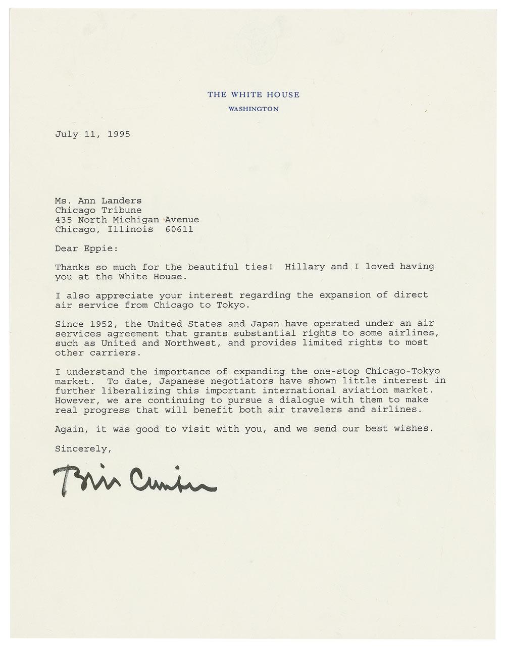 TLS as president, one page, 8.5 x 11, White House letterhead, July 11, 1995. Letter of thanks to Ann Landers at the Chicago Tribune for a gift and her interest in expanding air service from Chicago to Japan. In part, “Thank you so much for the beautiful ties…Since 1952, The United States and Japan have operated under an air services agreement that grants substantial rights to some airlines, such as United and Northwest, and provides limited rights to most other carriers. I understand the importance of expanding the one-stop Chicago-Tokyo market. To date, Japanese negotiators have shown little interest in further liberalizing this important aviation market.” In fine condition, with light paperclip impression to top edge. A seldom-seen size of presidential letterhead.