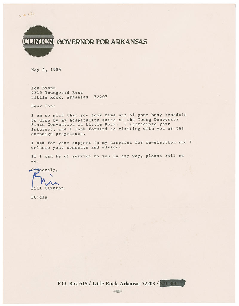 TLS signed “Bill,” one page, 8.5 x 11, Clinton Governor for Arkansas letterhead, May 4, 1984. Letter to a political supporter. In part: “I am so glad you took time out of your busy schedule to drop by my hospitality suite at the Young Democrats State Convention in Little Rock…I ask for your support in my campaign for re-election.” In fine condition, with a rusty staple hole to top left corner. Accompanied by the original mailing envelope.