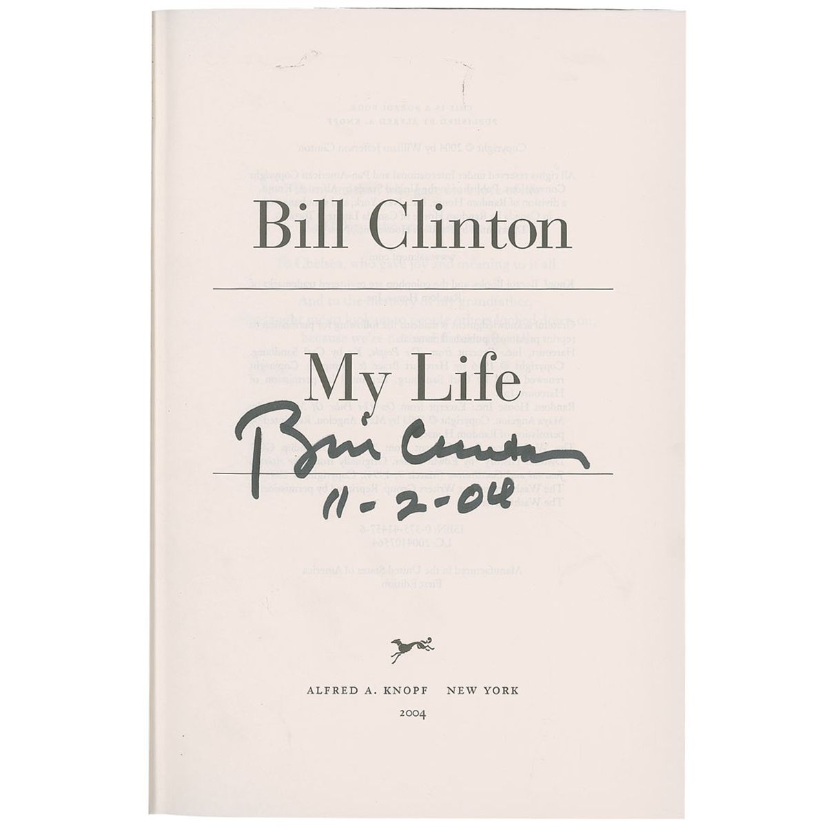Signed book: My Life. First edition. NY: Alfred A. Knopf, 2004. Hardcover with dustjacket, 6.5 x 9.5, 957 pages. Signed on the title page in black felt tip “Bill Clinton 11–2–04.” In fine condition with a small rectangular stain on the front pastedown.