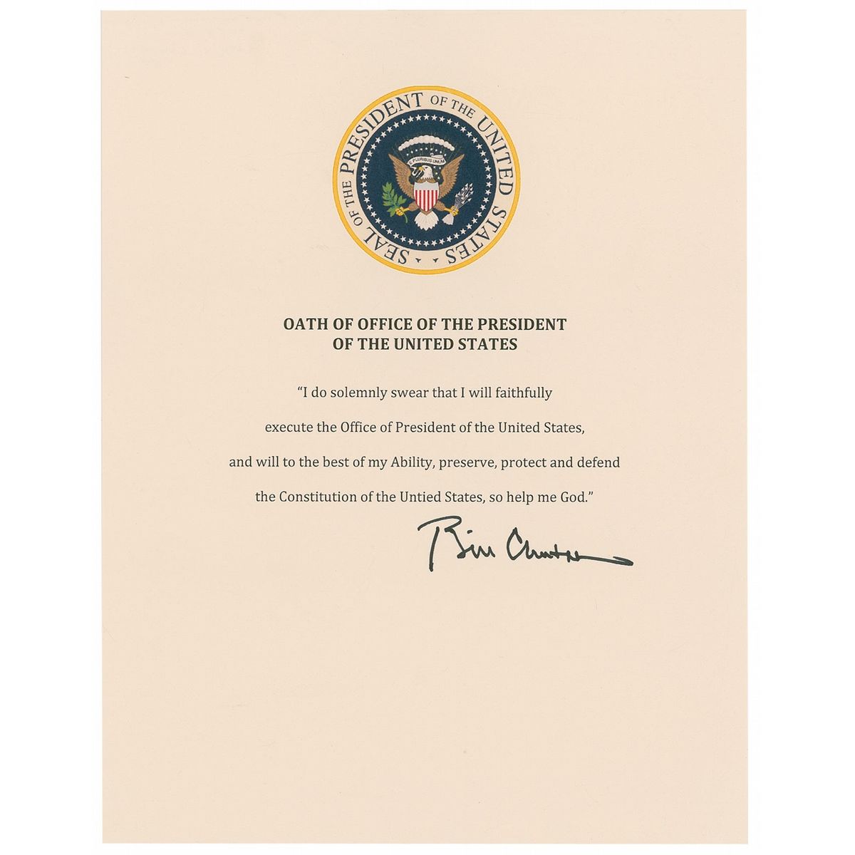 Printed Oath of Office on an 8.5 x 11 sheet, with the presidential seal at the top, signed in-person at the bottom in black felt tip “Bill Clinton.” In fine condition with horizontal bend touching the top of Clinton’s first name. Desirable, lesser-seen format for Clinton.