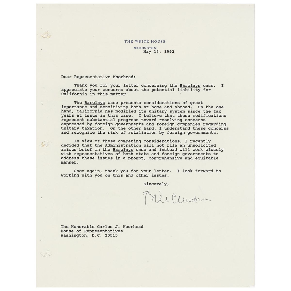 TLS as president, one page, 8.5 x 11, White House letterhead, May 13, 1993. Letter to Republican Congressman Carlos J. Moorhead of California. In full: “Thank you for your letter concerning the Barclays case. I appreciate your concerns about the potential liability for California in this matter. The Barclays case presents considerations of great importance and sensitivity both at home and abroad. On the one hand, California has modified its unitary system since the tax years at issue in this case. I believe that these modifications represent substantial progress toward resolving concerns expressed by foreign governments and foreign companies regarding unitary taxation. On the other hand, I understand these concerns and recognize the risk of retaliation by foreign governments. In view of these competing considerations, I recently decided that the Administration will not file an unsolicited amicus brief in the Barclays case and instead will work closely with representatives of both state and foreign governments to address these issues in a prompt, comprehensive and equitable manner. Once again, thank you for your letter. I look forward to working with you on this and other issues.” In fine condition, with three punch holes to left edge, which could be matted out.