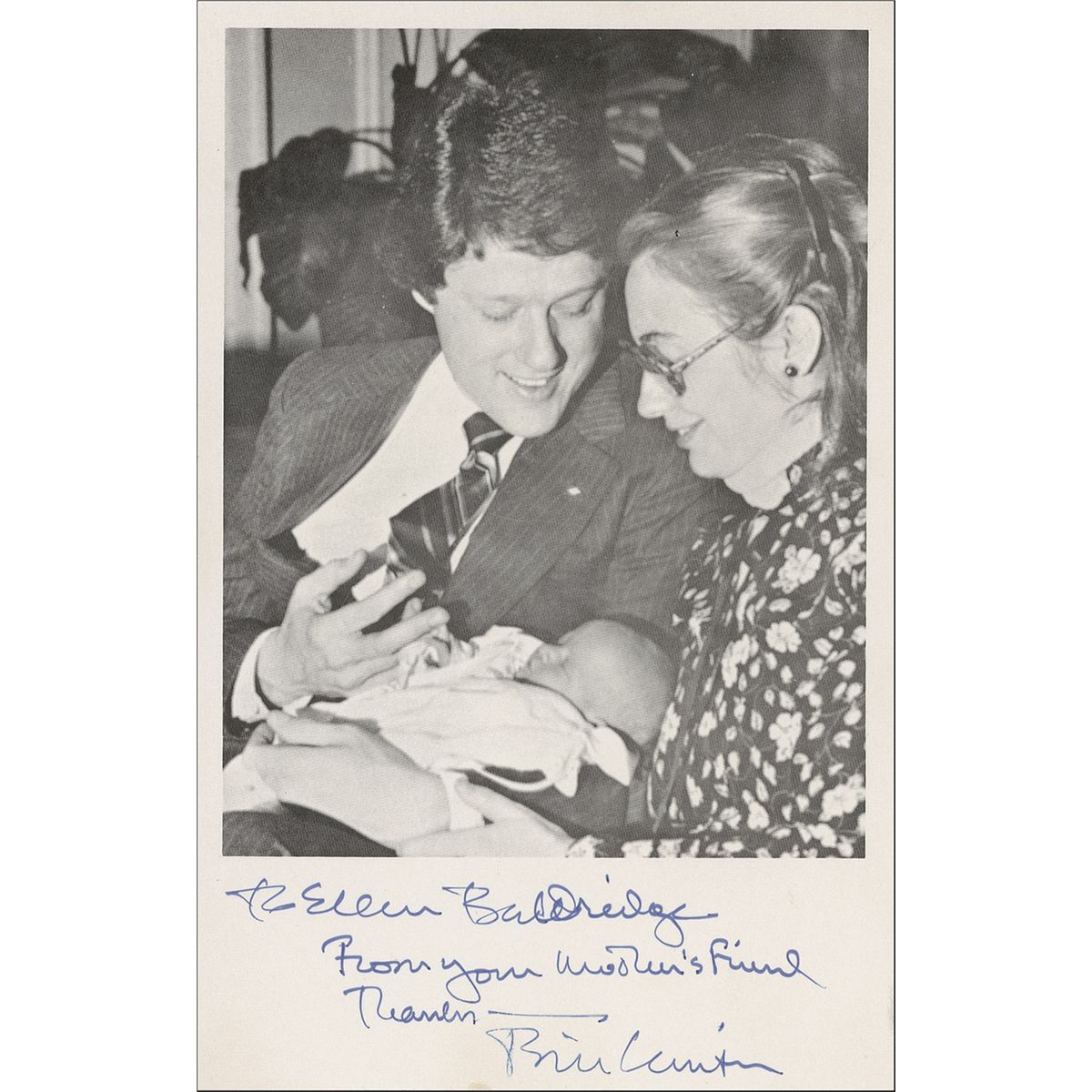 Cute 5.25 x 8.25 paperstock photo of a young Bill and Hillary Clinton doting over baby Chelsea, signed and inscribed in blue ink “To Ellen Buldridge, from your Mother’s friend, Thanks, Bill Clinton.” In fine condition, with trivial adhesive remnant to bottom edge.
