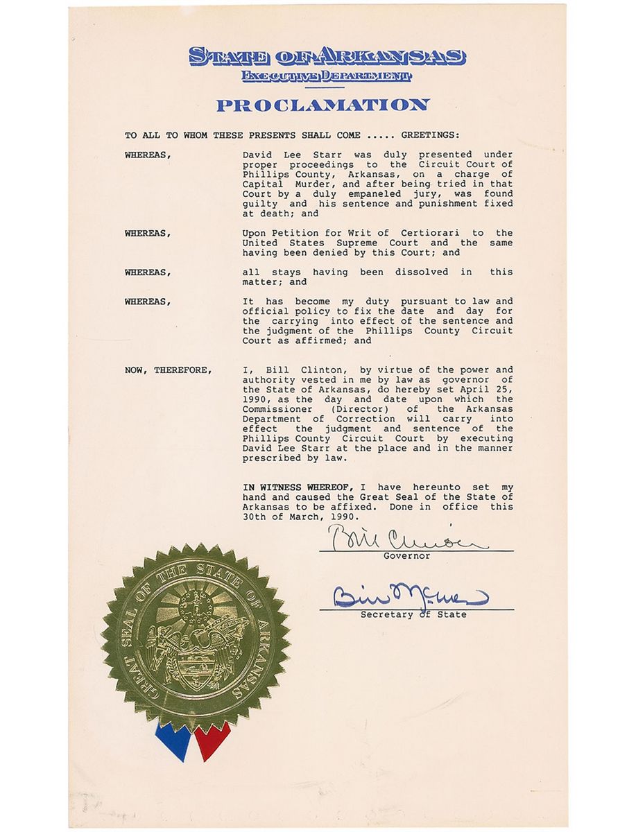 DS, one page, 8.5 x 14, March 30, 1990. Clinton sets an execution date for convicted murderer David Lee Starr. In part: “David Lee Starr was duly presented under proper proceedings…and after being tried in that Court by a duly empaneled jury was found guilty and his punishment fixed at death…Now, Therefore, I, Bill Clinton, by virtue of the power and authority vested in me by law as governor of the State of Arkansas, do hereby set April 25, 1990, as the day and date upon which the Commissioner (Director) of the Arkansas Department of Correction will carry into effect the judgement and sentence of the Phillips County Circuit Court by executing David Lee Starr at the place and in the manner prescribed by law.” Signed at the conclusion by Clinton and countersigned by his secretary of state. In fine condition, with some scattered light toning and creasing. The gold foil seal and ribbon are crisp and intact. Starr was convicted for the capital murder of a 76-year-old woman, which was later reversed by the 8th Circuit US Court of Appeals.