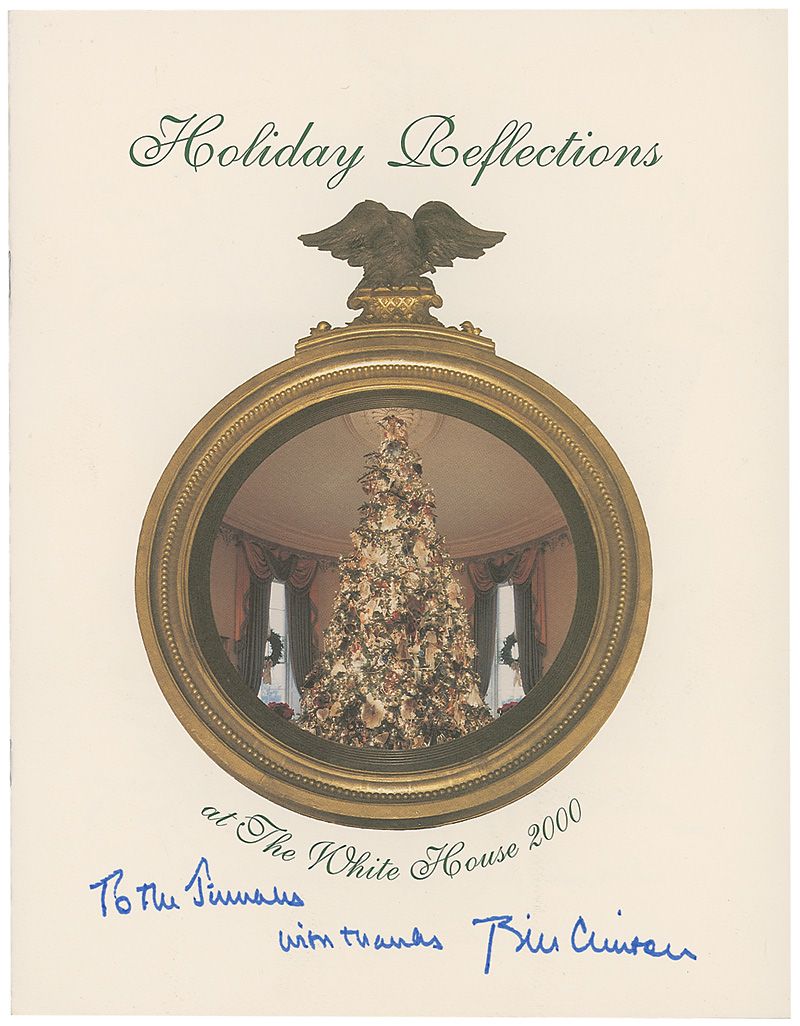 Commemorative program entitled ‘Holiday Reflections at the White House 2000,’ signifying the end of the Clinton’s eight years at the Executive Mansion, signed and inscribed on the cover in blue felt tip, “To the Tinnans with thanks, Bill Clinton.” In fine condition.