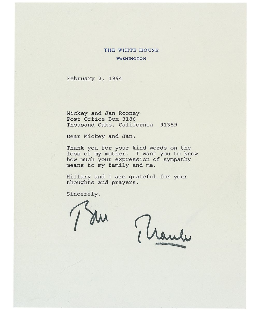 TLS as president signed “Bill” one page, 6.75 x 8.75, White House letterhead, February 2, 1994. Letter to Mickey and Jan Rooney. In full: “Thank you for your kind words on the loss of my mother. I want you to know how much your expression of sympathy means to my family and me. Hillary and I are grateful for your thoughts and prayers.” Clinton has also added and underlined “Thanks” below the typed letter. In fine condition. Clinton’s mother had died from complications of breast cancer in early January. An interesting piece of correspondence between Washington and old Hollywood.
