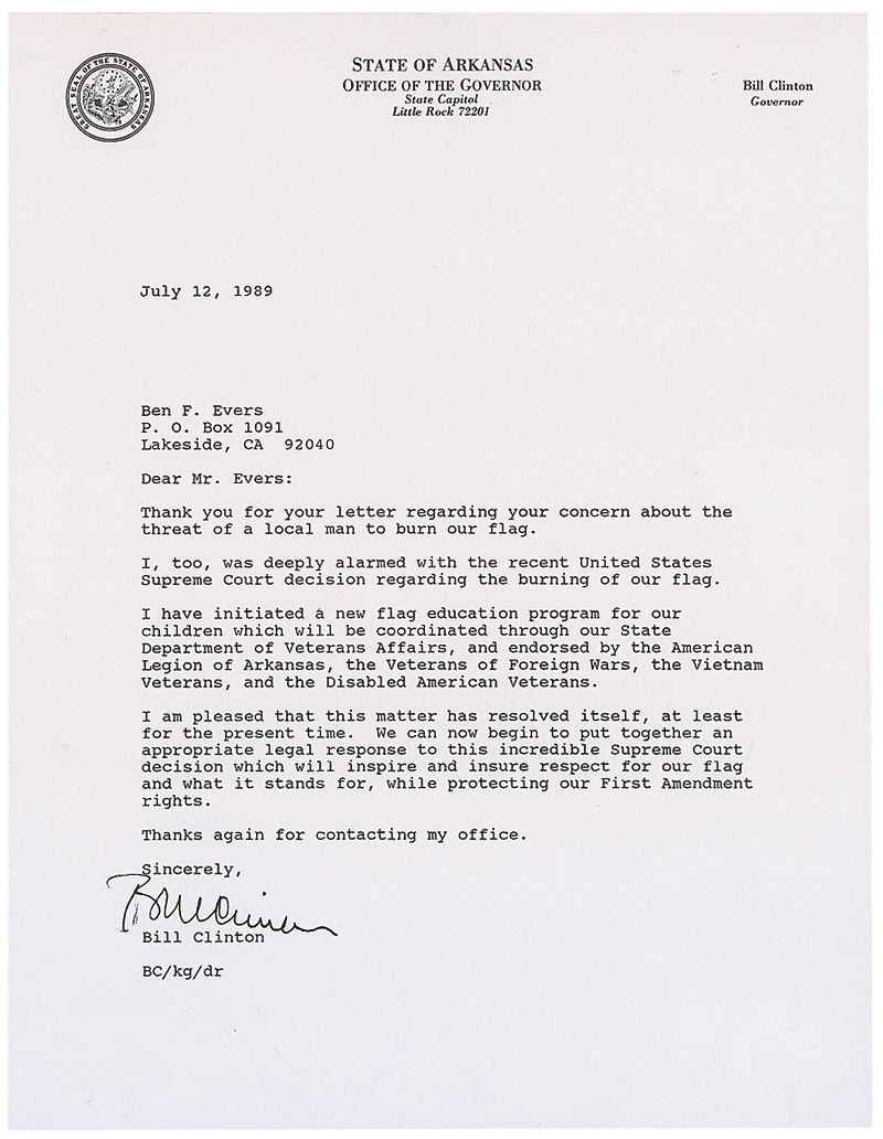 TLS, one page, 8.5 x 11, State of Arkansas letterhead, July 12, 1989. Clinton thanks a supporter and comments on flag burning. In part, “Thank you for your letter regarding your concern about the threat of a local man to burn our flag. I, too, was deeply alarmed with the recent United States Supreme Court decision regarding the burning of our flag…I am pleased that this manner has resolved itself, at least for the present time. We can now begin to put together an appropriate legal response to this incredible Supreme Court decision which will inspire and insure respect for our flag and what it stands for, while protecting our First Amendment rights.” Accompanied by the original mailing envelope. In fine condition. In 1989 and again in 1990, the United States Supreme Court ruled that due to the First Amendment, a government cannot prohibit the desecration of a flag, as it displayed a form of ‘symbolic speech.’ While an amendment to protect the flag has been passed several times by the House of Representatives, it has failed in the Senate each time.