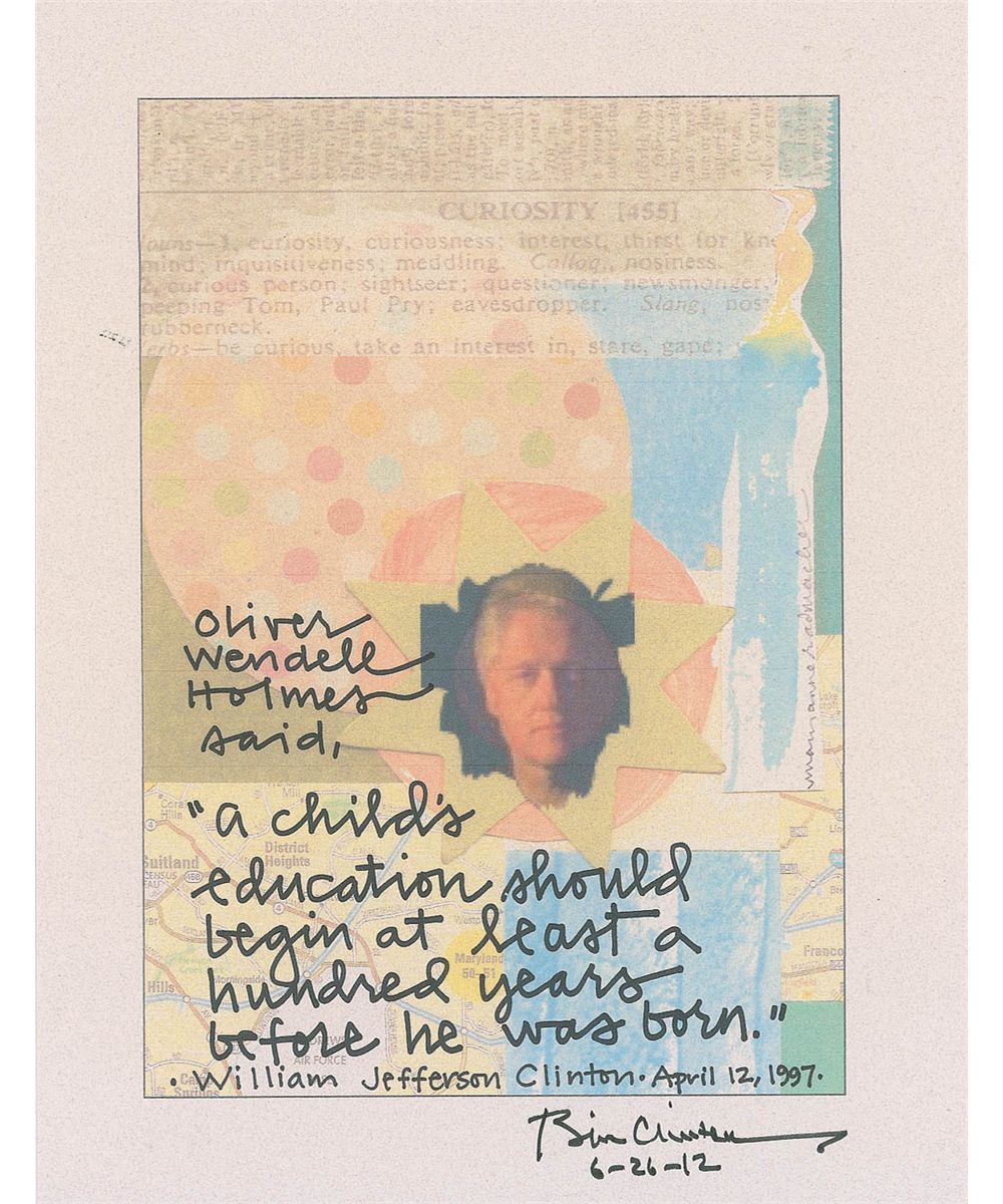 Color 8.5 x 11 print entitled ‘A Child’s Education’ bearing a quote from Oliver Wendell Holmes, used by Clinton in a 1997 speech, signed in the lower border in black felt tip, “Bill Clinton 6-26-12.” In fine condition. Accompanied by a certificate of authenticity from the Clinton Museum Store.