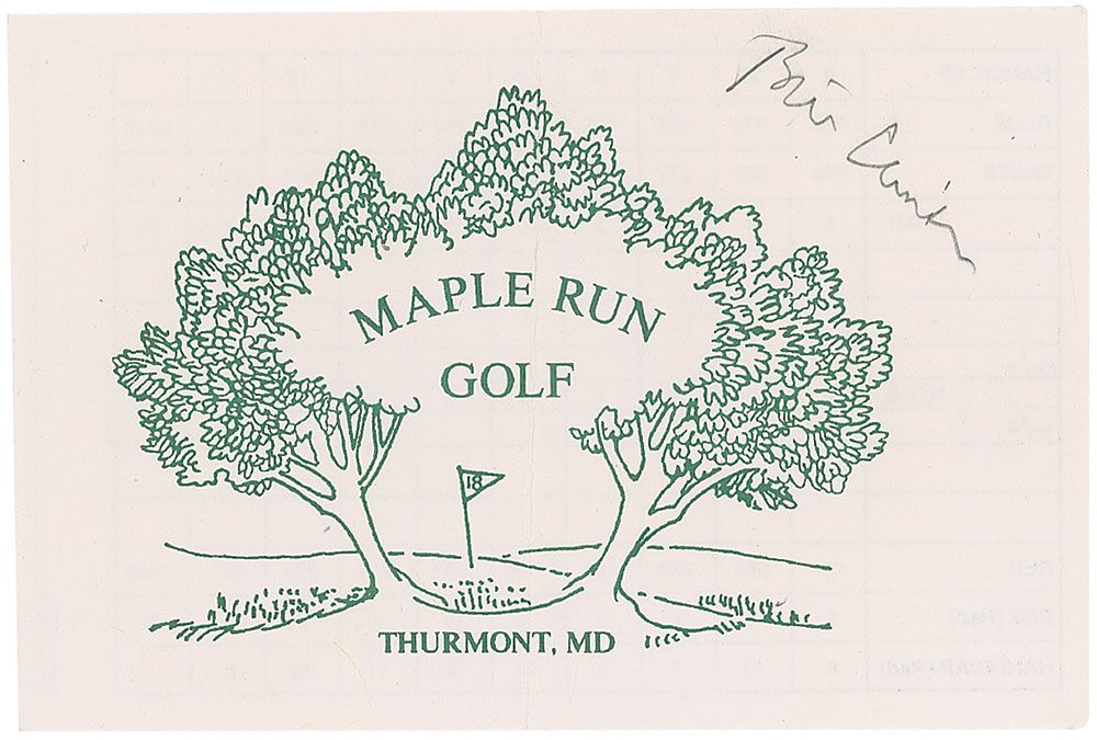 Unused golf scorecard from the Maple Run Golf Course in Thurmont, Maryland, 6.25 x 4.25, signed on the front in pencil by Clinton. A central vertical fold and light handling wear, otherwise fine condition.