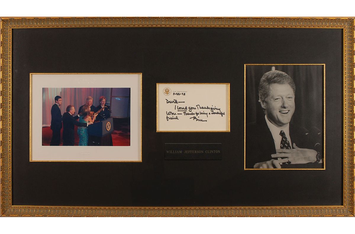 Uncommon ALS as president signed “Bill,” one page, 6 x 4, The President letterhead, November 22, 1993. Short letter of thanks. In full: “I loved your Thanksgiving letter—Thanks for being a wonderful friend.” Nicely matted and framed with two photos to an overall size of 31 x 17.5. In fine condition. Oversized.
