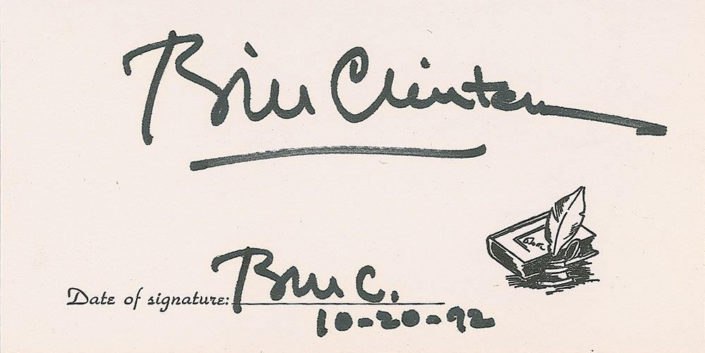 Felt tip signature, “Bill Clinton,” signed again at the bottom, “Bill C. 10-20-92,” on an off-white 5.5 x 2.75 card. In fine condition. Accompanied by an unsigned engraved portrait.